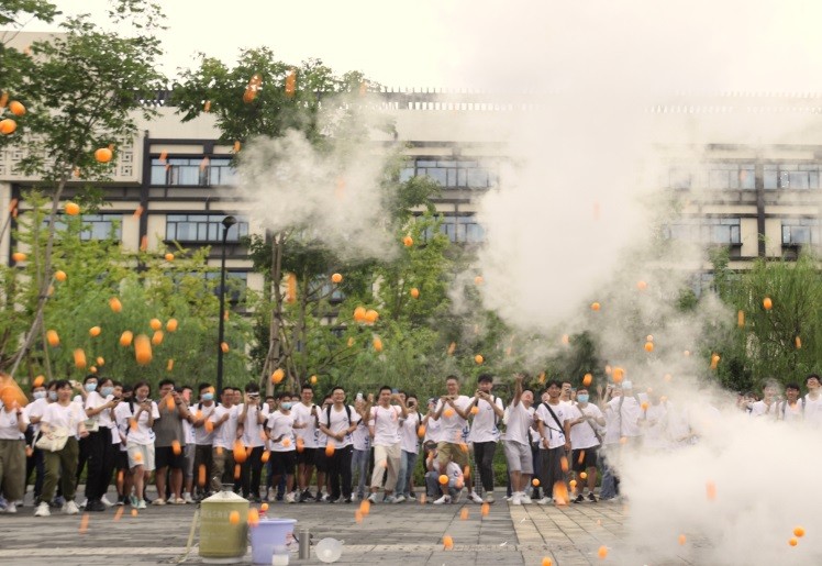 在大一新生好奇目光的注视下,陈斌老师讲解了液氮的物理小知识,然后将灌入液氮的矿泉水瓶放进了漂浮着乒乓球的水桶之中。稍候片刻,随着“砰”的一声响,矿泉水瓶炸裂开来,其中液氮汽化约700倍体积膨胀产生的巨大压强将桶内的乒乓球冲上最高15米的空中。雾气缭绕之中,一个个橙红色的小球纷纷落下,像极了丰收的小柿子。同学们上前捡拾带有数字的乒乓球,数字对应的盲盒可能开出杭师大精美周边小礼物,也可能对应了新伙伴们的微心愿。同学们互爱互助来实现彼此的微心愿,这也正契合了开幕式活动的主题“愿冲云霄之物理有爱”。
