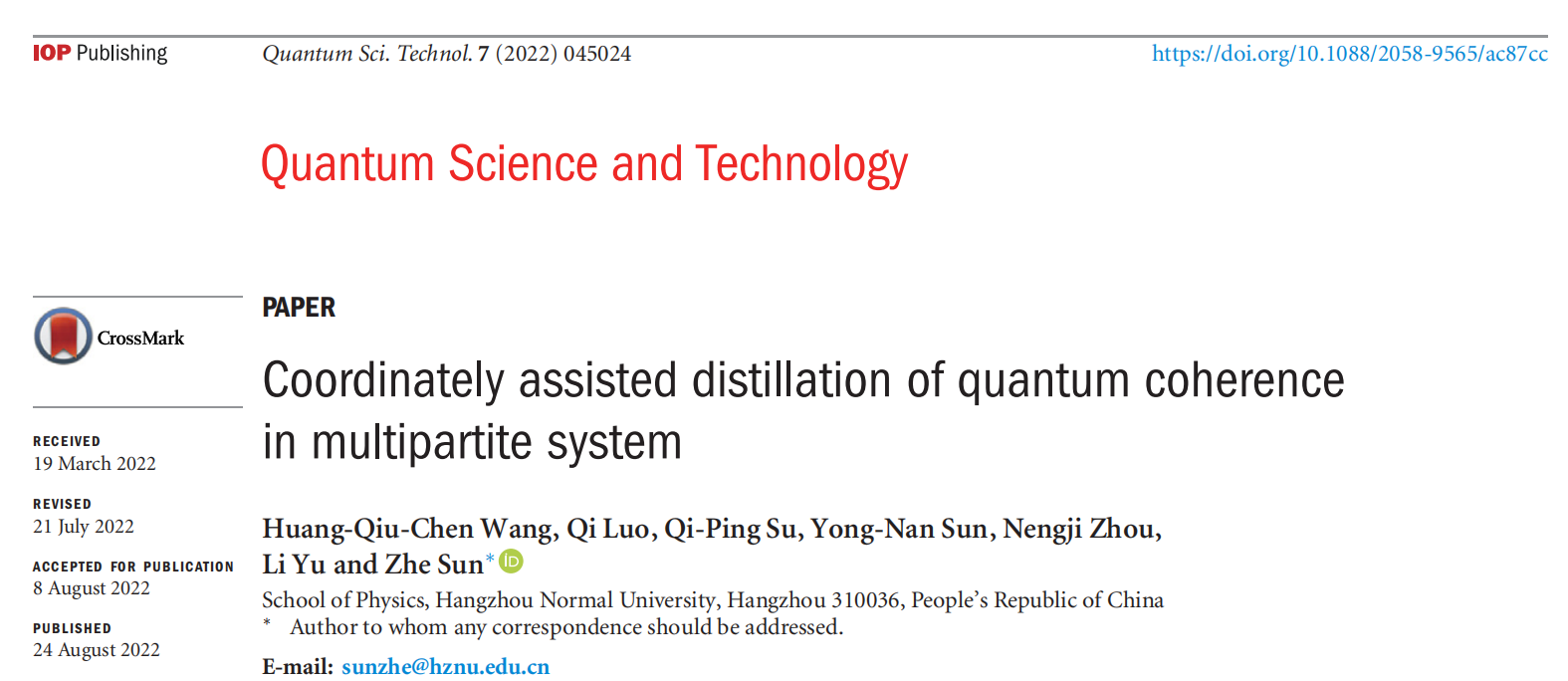 近日,换妻 量子信息与量子光学创新团队孙哲教授及团队成员在多体量子系统中的辅助相干蒸馏研究方面取得成果,在英国物理协会(IOP)旗下权威期刊《Quantum Science and Technology》(IF:6.568)发表题为“Coordinately assisted distillation of quantum coherence in multipartite system”学术论文。