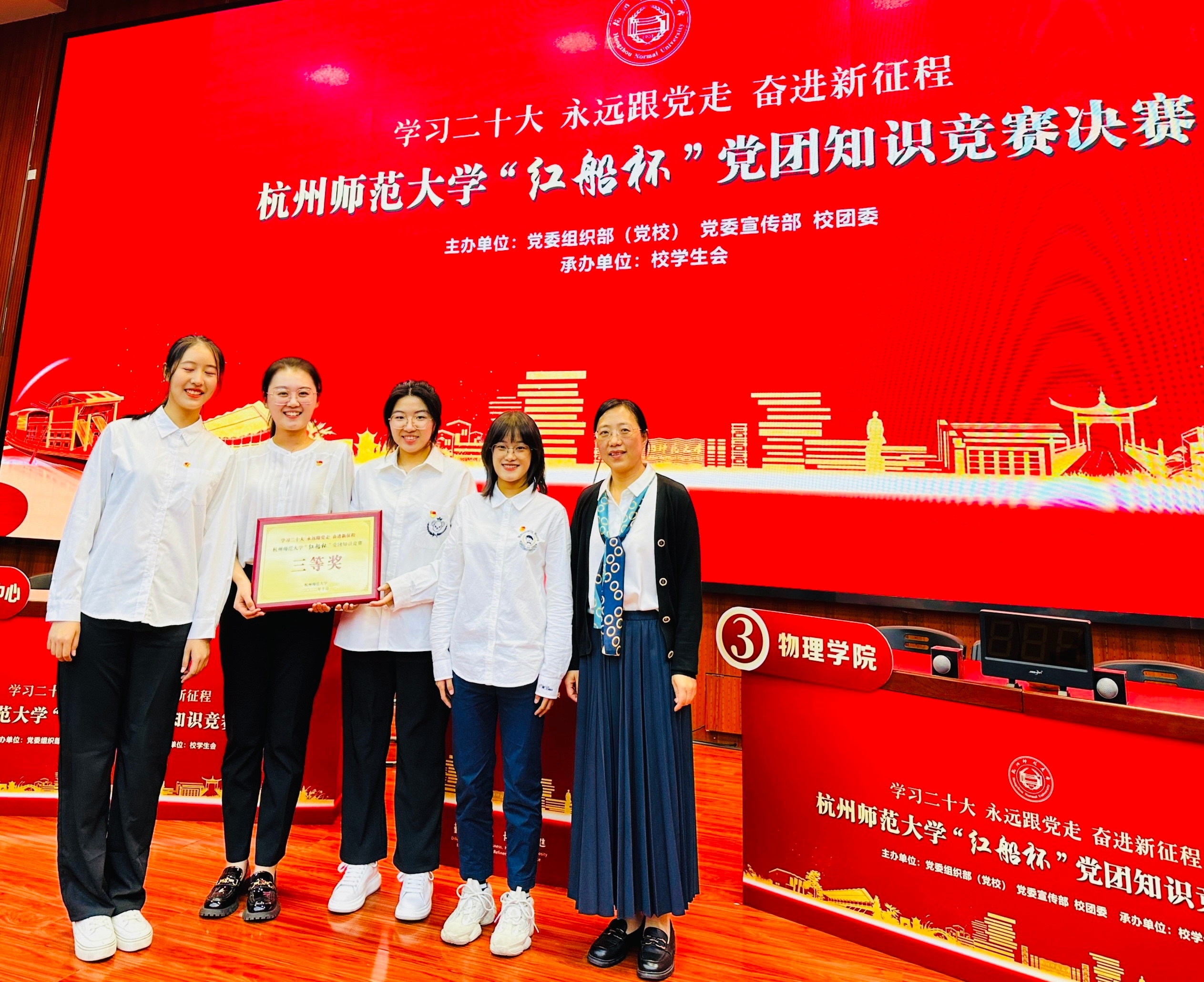 在10月26日的决赛中,换妻 以王淑君书记为领队,由2022级新生辅导员乔文琦老师担任队长,带领物理203毛俊驰同学、物理211李心悦同学以及物理212郑懿格同学组成队伍,以“格物穷理,明德笃行,扬帆逐梦,拼搏奋进”为口号,在比赛中展现了丰富的党团知识储备,体现了积极向上的新时代青年风貌,充分展现了换妻 师生优良的政治素养。凭借出色表现,换妻 荣获“红船杯”知识竞赛第四名(三等奖)和优秀组织奖两项荣誉。