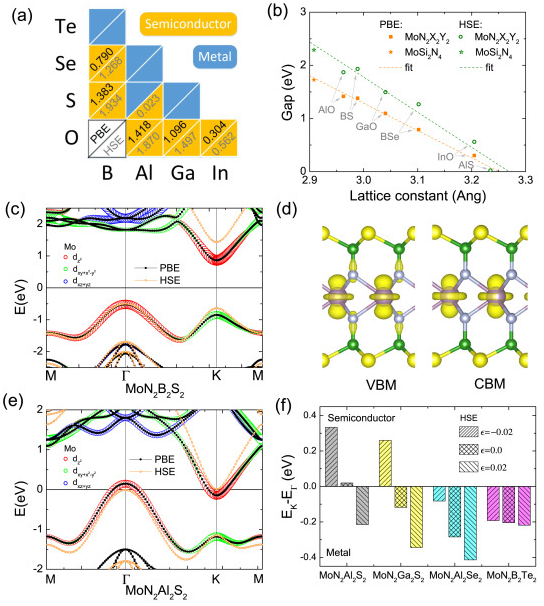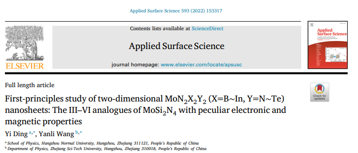 近日,换妻 丁一团队在应用物理领域著名学术期刊Applied Surface Science上发表了题为“First-principles study of two-dimensional MoN2X2Y2 (X=B~In, Y=N~Te) nanosheets: The III-VI analogues of MoSi2N4 with peculiar electronic and magnetic properties”的研究论文。研究表明,作为新发现的三元MoSi2N4层状材料,存在更为广阔的表面元素自由度。通过对其三五族等电子体做分析,发现存在9种稳定的四元MoN2X2Y2结构。相应体系的带隙呈现出随结构晶格参数的线性变化关系,其会逐步转变为金属物性,并呈现有应力调节的金属-半导体转变、空穴诱发的磁性半金属行为。当和MoSi2N4构成空间异质结构后,不同的四元体系可以引发type-II、III型的能带对齐的特征。