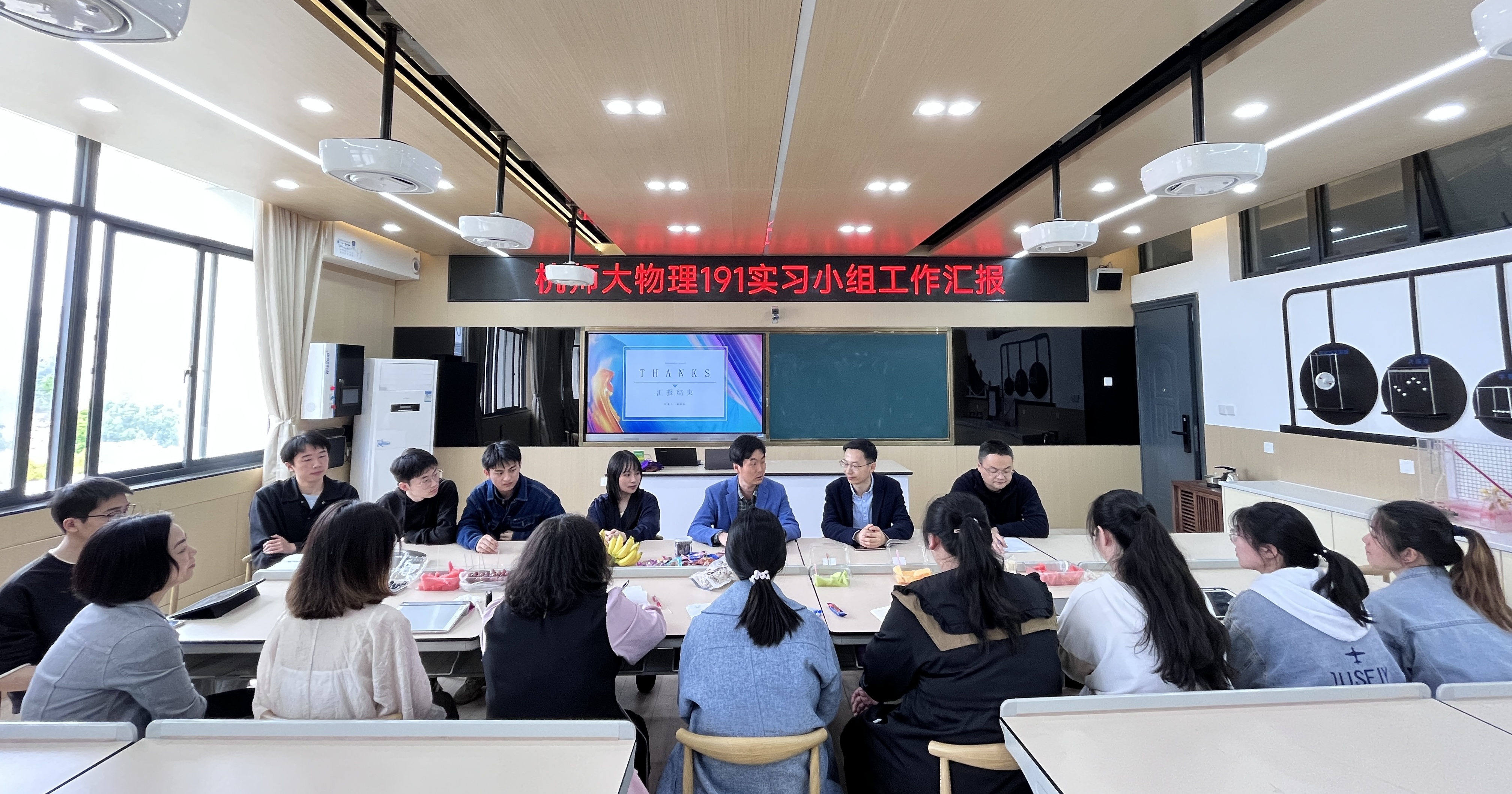 余杭中学物理教研组组长张彬老师介绍了学校概况、实习安排以及近两年该校招聘师资的趋势和要求。李玉科教授代表学院感谢余杭中学细致、有效的实习安排,介绍了目前学院各专业的发展情况和就业促进工作的安排,双方就深化实习、就业合作开展了相应交流。物理191班谢奇浩代表实习小组做实习成果展示,带队指导老师吴平和实习生一同参与座谈。