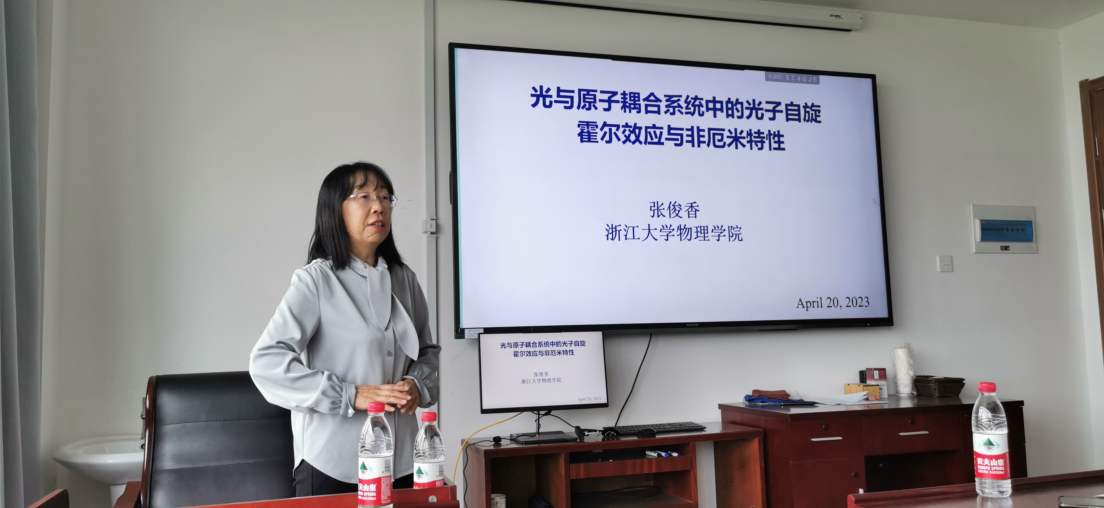 4月20日上午换妻 特邀浙江大学张俊香教授作题为《光与原子耦合系统中的光子自旋霍尔效应与非厄米特性》的学术报告。报告中,张俊香教授介绍了他们实验室在光子的自旋霍尔效应以及非厄米特性两个方向的最新研究成果。张教授从电子自旋霍尔效应的起源引入,介绍了光子的自旋霍尔效应,也即光在折射率阶跃变化或非均匀介质中传输时介质充当了电子外加电场的角色,从而产生与自旋有关的光子横向位移分离。此外,张教授详细介绍了他们实验室在光与原子耦合系统中,利用光学相干效应操控系统折射率,产生各向异性以及非厄米光学势,实验观测了原子中光子自旋霍尔效应与光子非互易传输的特性。