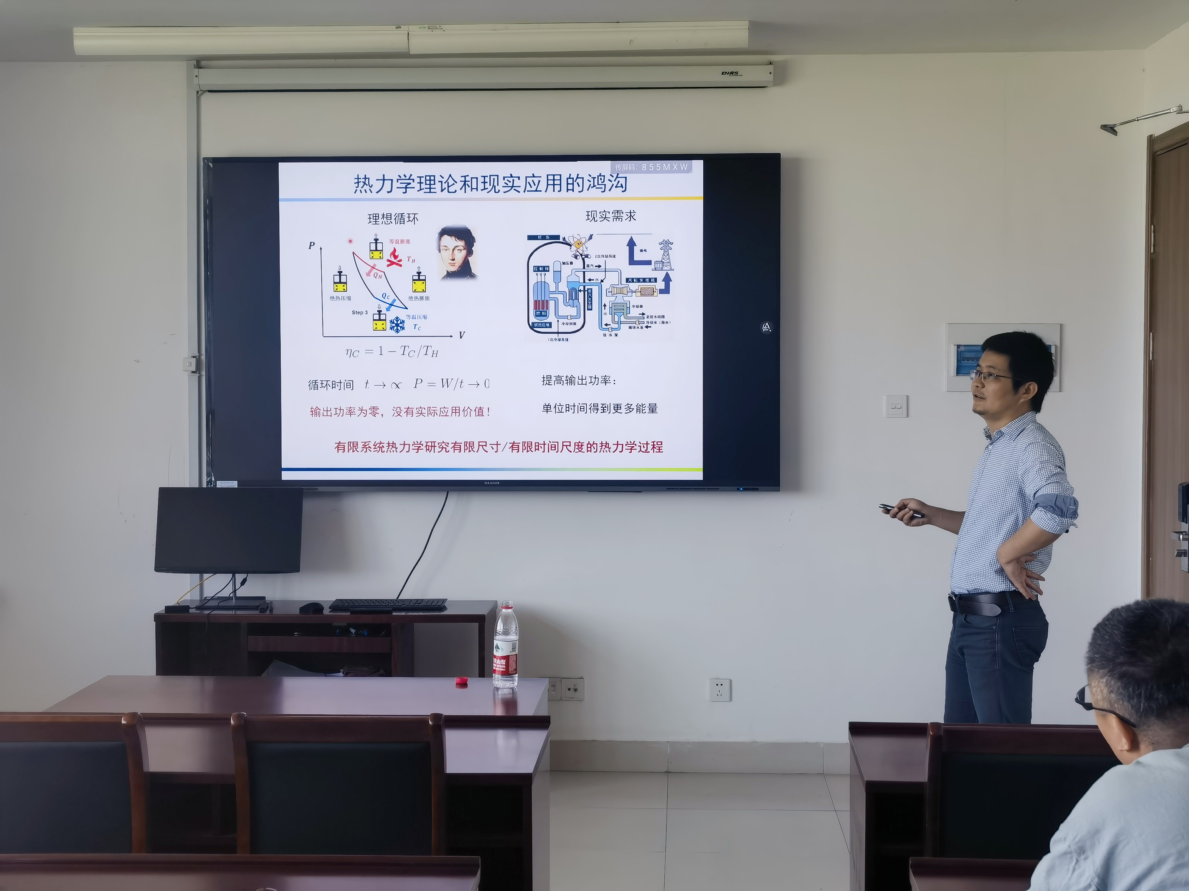 5月15日上午,中国工程物理研究院研究生院(北京) 董辉研究员应邀来换妻 作题为《有限时间热力学》的学术报告。报告中,董辉研究员围绕有限时间循环中能源利用的设计优化,介绍了他们团队在相关的理论以及实验研究方面的进展。热能作为能源的重要形式一直是发展新型清洁能源的重要方面。新能源设计中对输出功率的需求对热力学的发展提出了新的挑战,催生了有限时间热力学这一重要研究方向。董辉研究员从当前核电站中最新一代热机的功率和效率提升这一重要实际问题入手,详细介绍了他们实验室在探究有限时间热力学中最优循环过程以及时间标度律方面的重要突破性工作。