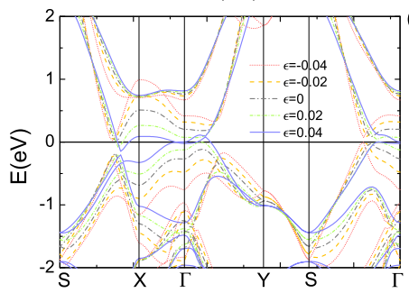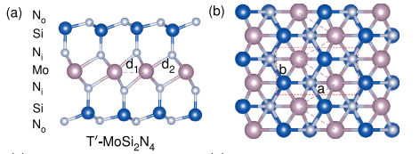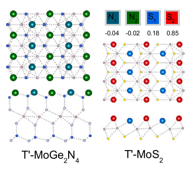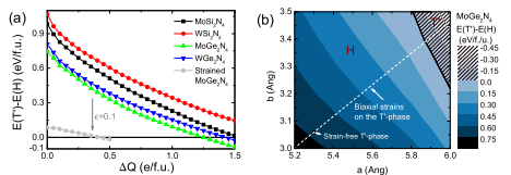 通过计算不同掺杂电荷浓度下,三棱柱相(H)与畸变八面体相(T’)体系的总能差,发现不同与MoS2体系,在MA2Z4体系中,需要巨大的掺杂电荷量才可以诱发H-T‘相变。同样,计算不同应力条件下两者的能量差,发现T’的存在范围较小。但是,当同时存在电荷掺杂和应力条件时,畸变八面体相MA2Z4体系则比较容易出现。