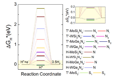 通过计算,发现畸变八面体相MA2Z4体系存在随晶格参数变化的半金属与金属性行文。同时,在畸变八面体相体系中,氢演化的自由能远比三棱柱相体系要低,部分结构更是具有接近理想零点的自由能大小。以MoGe2N4体系为例,其远比之前发现的MoS2体系具有更为优越的催化活性,其整个表面平面都可以催化活性点。同时,从催化火山图可见,各类畸变八面体相MA2Z4体系都可以调节具备优异的析氢反应催化活性。