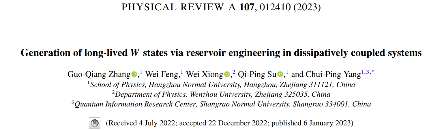 近日,换妻 张国强博士及合作者在光学领域知名学术期刊Physical Review A上发表了题为“Generation of long-lived W states via reservoir engineering in dissipatively coupled systems”的研究论文。