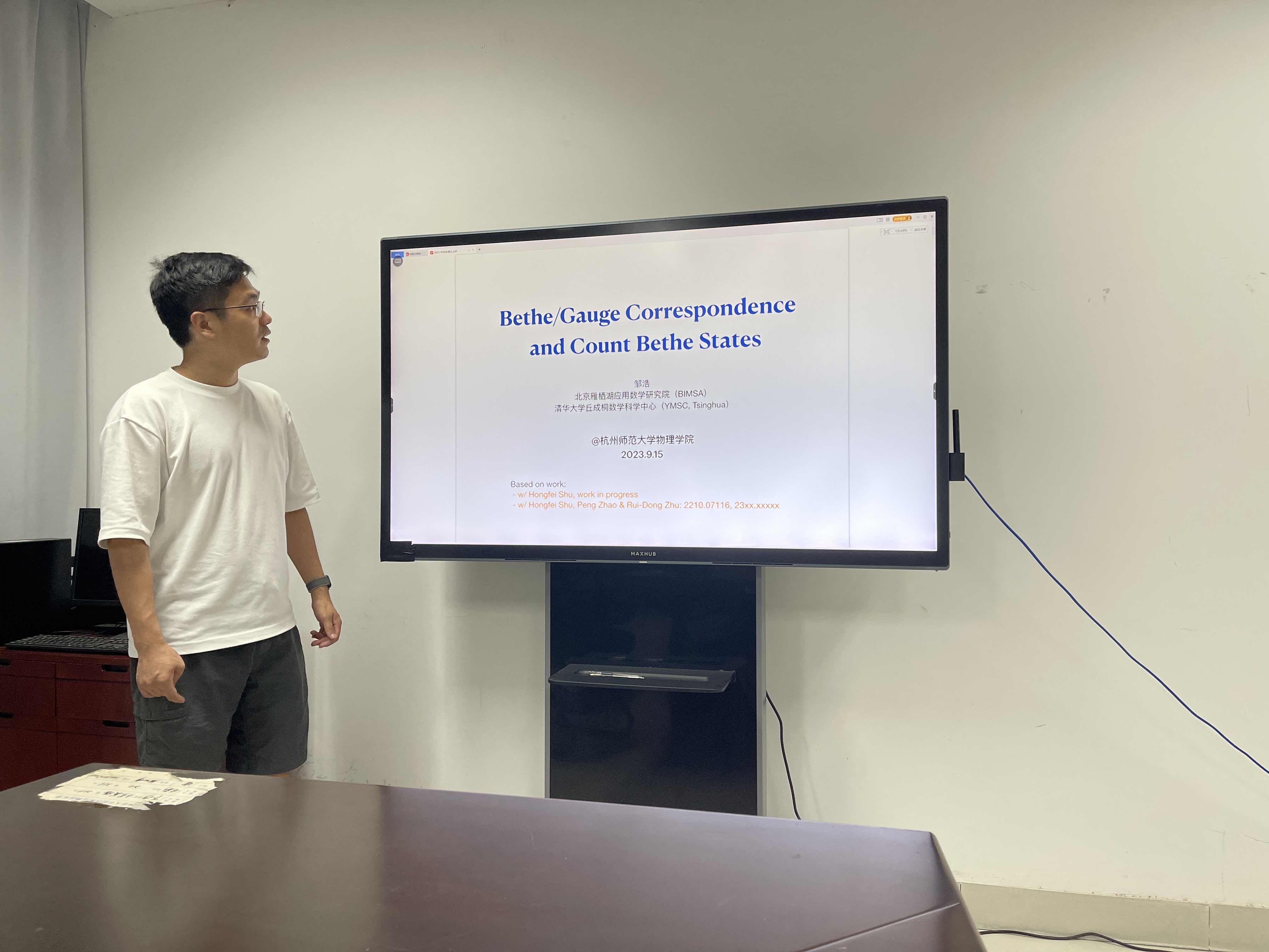 9月15日下午,北京雁栖湖应用数学研究院和清华大学丘成桐数学科学中心的邹浩士博士应邀来换妻 ,为院内师生带来了一场精彩的学术报告。报告的题目是《Bethe/Gauge Correspondence and Count Bethe States》,主要介绍了可积系统里Bethe States的数态问题,Bethe/Gauge Correspondence的对应关系,以及如何把Bethe/Gauge Correspondence应用到超对称规范场论里解决数态问题。