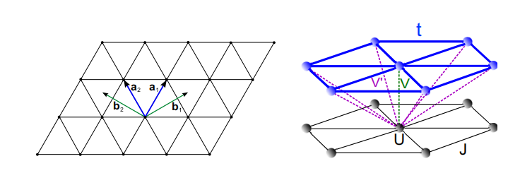 晶格中的自旋由于相互作用,在低温下往往会形成铁磁或反铁磁等有序态,几何阻挫和量子涨落是形成自旋液体态的两个重要因素。三角晶格中互为近邻的三个自旋在反铁磁交换作用下无法同时满足两两之间的能量最低构型,形成几何阻挫,为自旋液体态提供一个舞台。但是单纯的这样的自旋系统其基态是120度的反铁磁有序态。引入巡游电子与局域自旋的近腾耦合是产生量子涨落的一种方式。但随之而来形成另一种困难,由于三角晶格中的巡游电子在费米面的态密度总是有限的,任意有限的杂化作用都会形成重费米子态,在实验上表现为一个大费米面,而不是由局域自旋形成自旋液体后的小费米面。我们引入除在位杂化外的近邻杂化,从而使系统形成近腾阻挫,在某个特定的近腾阻挫强度下,成功地破坏了重费米子态,使自旋液体态可以解耦出来,为实验上寻找自旋液体态提供了一种可行的方案。