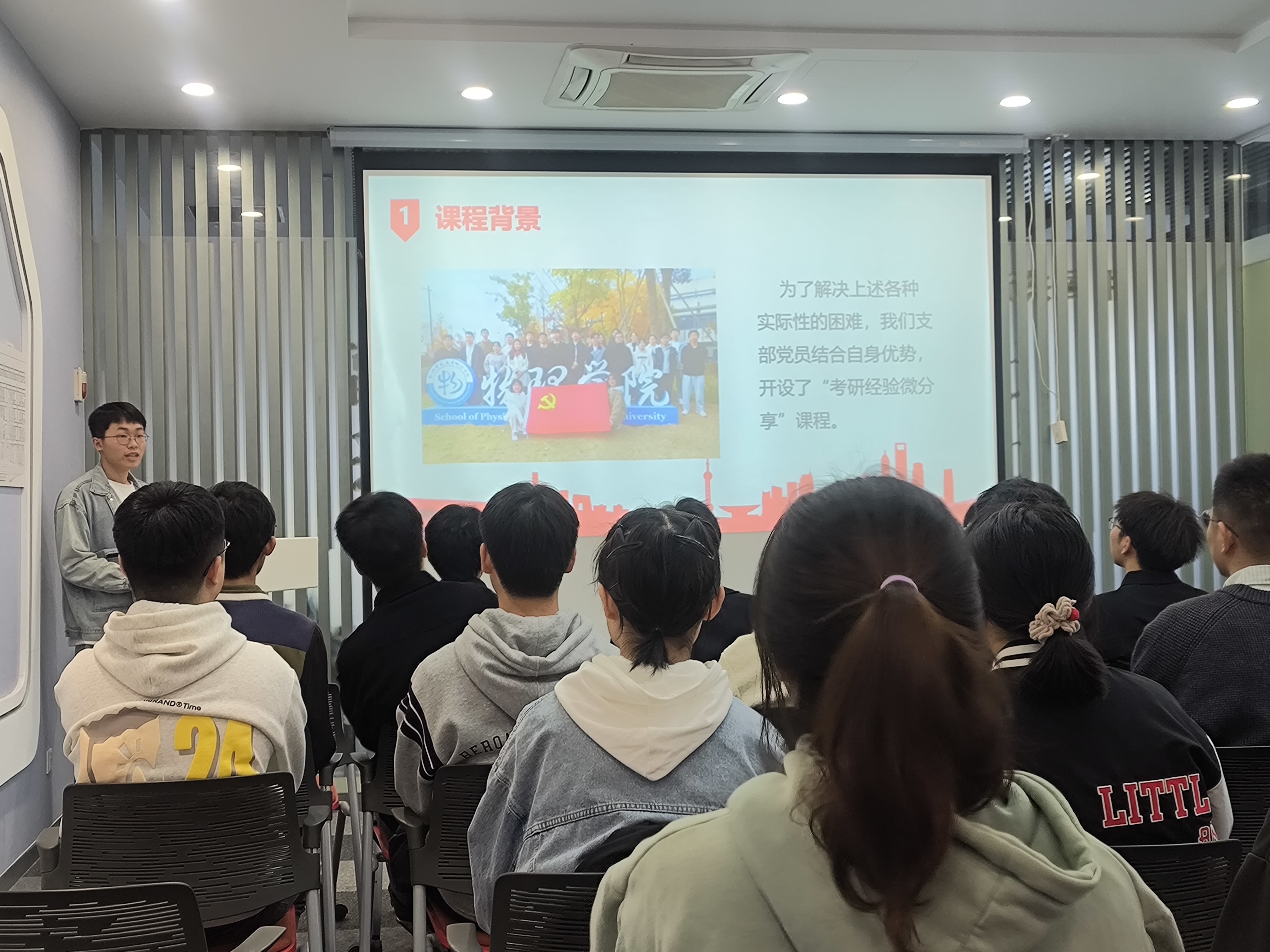 活动由支部书记李子豪主持,他首先对开展考研经验微分享课程背景和意义进行了介绍,主要是旨在为本科生同学更好地考研服务,分享了活动开展形式,对课程的6个主题进行了简要的介绍,并总结了活动开展以来的成果。随后,由主讲过考研经验微分享课程赵华金进行课程展示,让支部党员对课程的内容提出建议,以便更好地完善课程,同时也是为新加入支部的新生党员做一次示范,为接下来她们加入这一活动做准备。课程展示结束之后,李子豪向支部党员介绍了支部特色活动的下一步安排,围绕物理学的各个学科专业方向进行专业剖析,帮助考研的同学更好的选择自己感兴趣的研究方向。最后,由李林勃同志进行关于凝聚态方向的介绍,并由全支部党员共同思考,提出相应的修改意见,为之后这个新活动的开展打下基础。