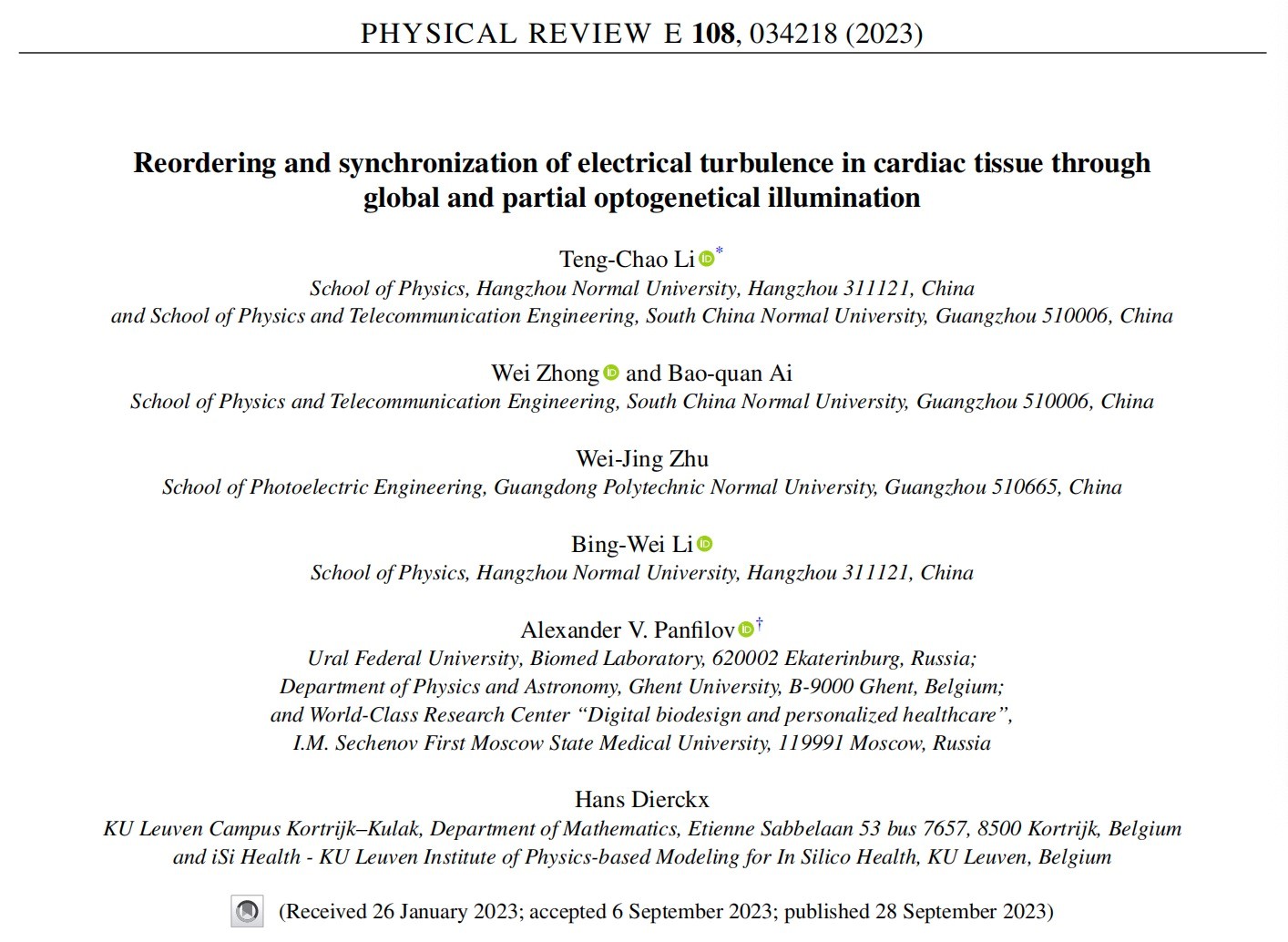 近日,换妻 李腾超副教授及合作者在统计物理和复杂系统领域重要学术期刊上发表题为“Reordering and synchronization of electrical turbulence in cardiac tissue through global and partial optogenetical illumination”的研究论文。