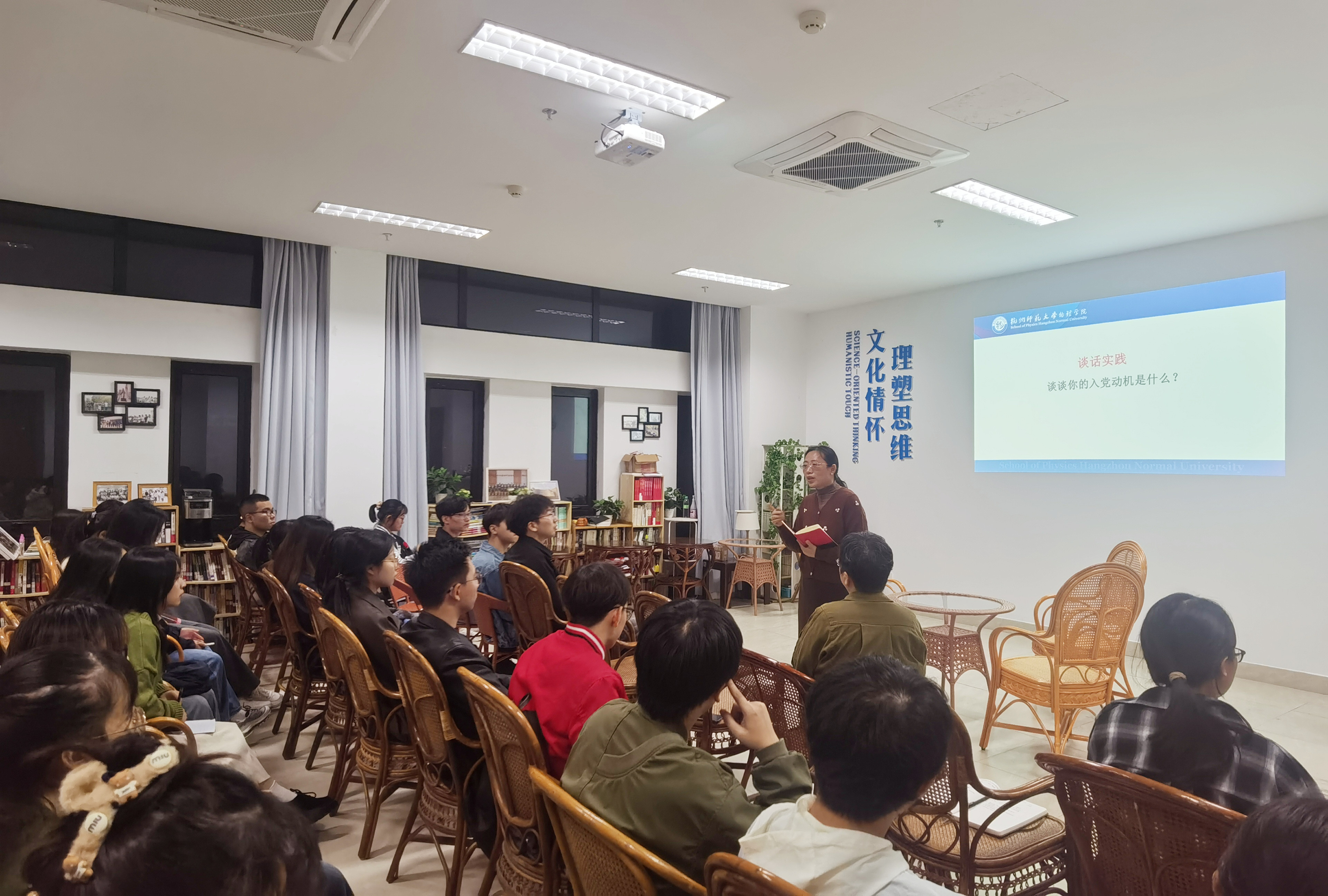 培训内容由讲解和现场演示两个方面组成。首先,王书记给大家讲解了入党积极分子考察谈话的基本要求,以及应该围绕哪几个方面展开,并选择其中一个问题“入党动机”做了详细展开,包括谈话前的准备、谈话时的技巧、后续的整理记录等,都做了讲解。随后,两组正式党员和积极分子上台进行现场谈话,两组同学围绕入党动机这个主题进行了谈话,台下的党员们对谈话内容和过程的优点和不足之处进行了点评,王书记也提了宝贵的建议和意见。