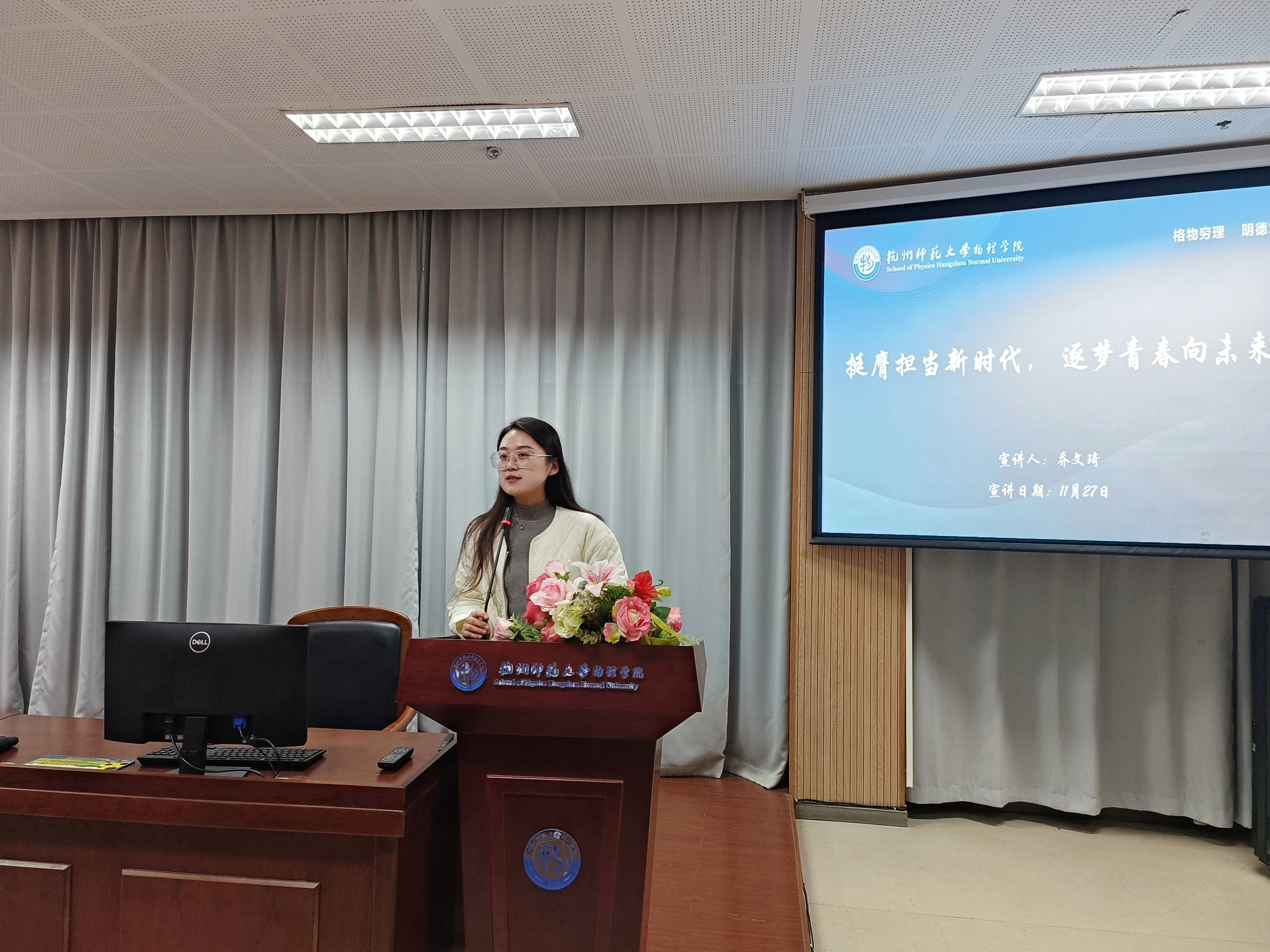 最后,乔文琦进行了题为《以亚运之窗,展青春之貌》的宣讲。她以亚(残)运会演职领队的亲身经历,向同学们讲述了杭师大仪式标兵组217名女生在筹备亚运会开幕式背后所经历的故事。从7月1日至10月22日,在这115天里,她们体验过39度的酷暑高温,也曾在绵绵细雨中咬牙坚持;见过凌晨三点的大莲花,也赶过早晨六点的班车;吃过难忘的“一百分”套餐,也为了补觉“席地而睡”……但无论过程怎样艰难,她们从来没有选择过放弃。乔文琦结合此次亚运会的经历提出,新时代青年,恰逢其时,有更宽广的舞台,不要害怕去经历,不要害怕去面对风雨,也不要害怕会遇到困难,只有经历一次次考验才有成长,相信大家在经历过磨练后,都会迎来属于自己的高光时刻。