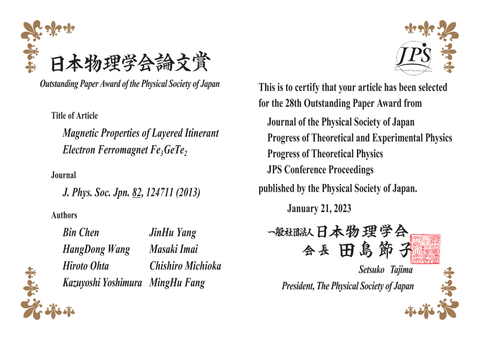 在最近结束的日本物理学会秋季会议中,换妻 陈斌、杨金虎、王杭栋老师与浙江大学方明虎教授团队以及日本京都大学吉村一良教授团队共同发表的论文“Magnetic Properties of Layered Itinerant Electron Ferromagnet Fe3GeTe2”(J. Phys. Soc. Jpn. 82, 124711 (2013) 被引次数217)获得年度论文奖。
