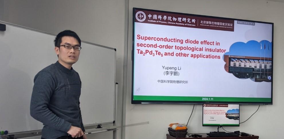 2024年1月11日下午,中国科学院物理研究所的李宇鹏博士应邀来换妻 作题为“二阶拓扑绝缘体Ta2Pd3Te5的超导二极管效应及其他应用研究”的学术报告。李宇鹏博士主要从事拓扑和超导材料的物性探索以及其在二维器件中的非常规输运研究。