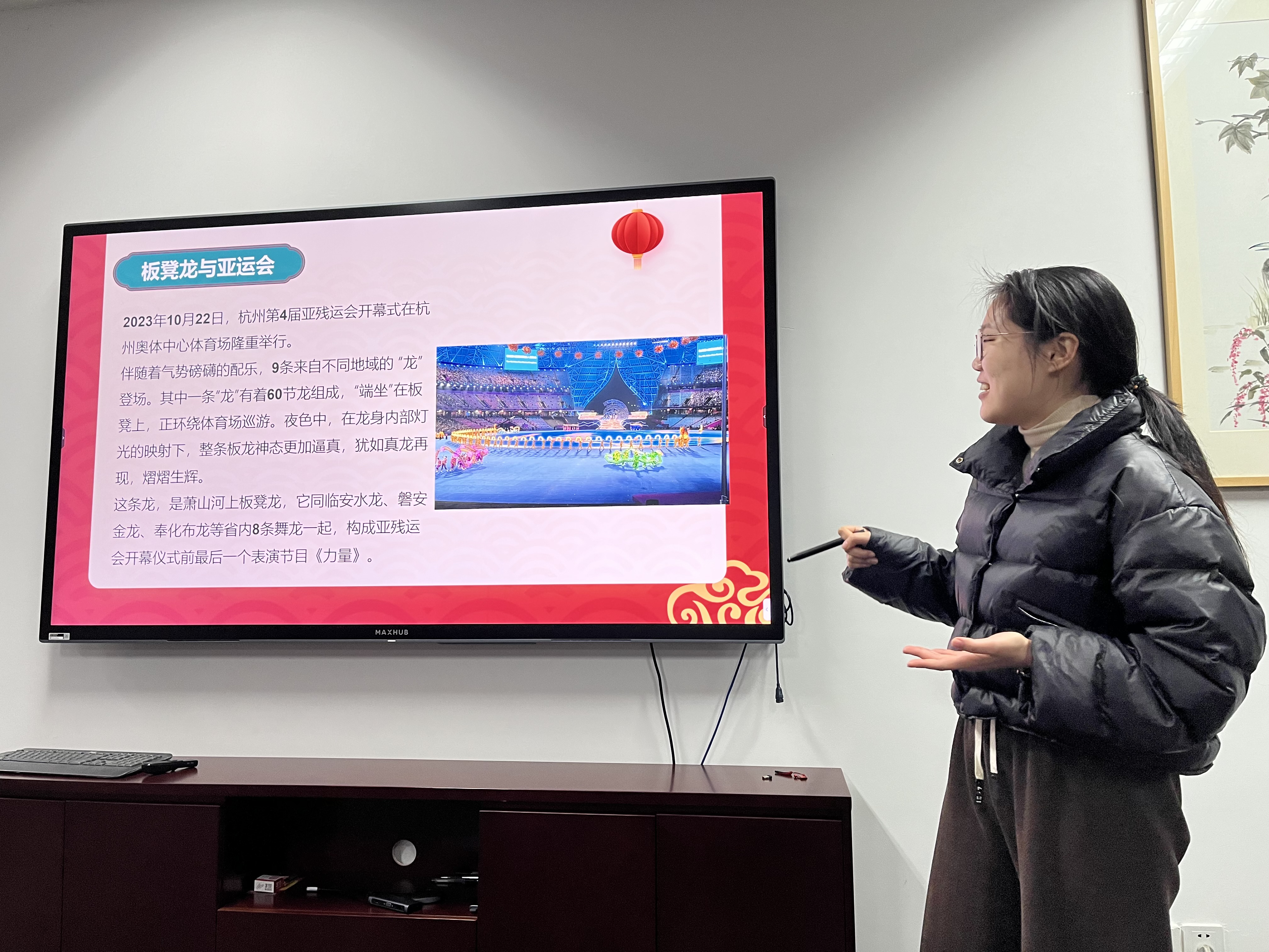 胡杉彤同学介绍了家乡金华的民俗活动——板凳龙。这项活动起源于汉代,是南方盛行的元宵节传统民俗活动,已被列为国家级非物质文化遗产。在杭州亚残运会开幕式上,改良后的板凳龙表演更是展示了震撼人心的力量,体现了传统与创新的完美结合。板凳龙作为中国传统文化的组成部分,展现了传统文化的魅力和深厚内涵,通过年轻一代的参与和创新,板凳龙焕发出新的生命力,成为连接过去和未来重要的文化桥梁。