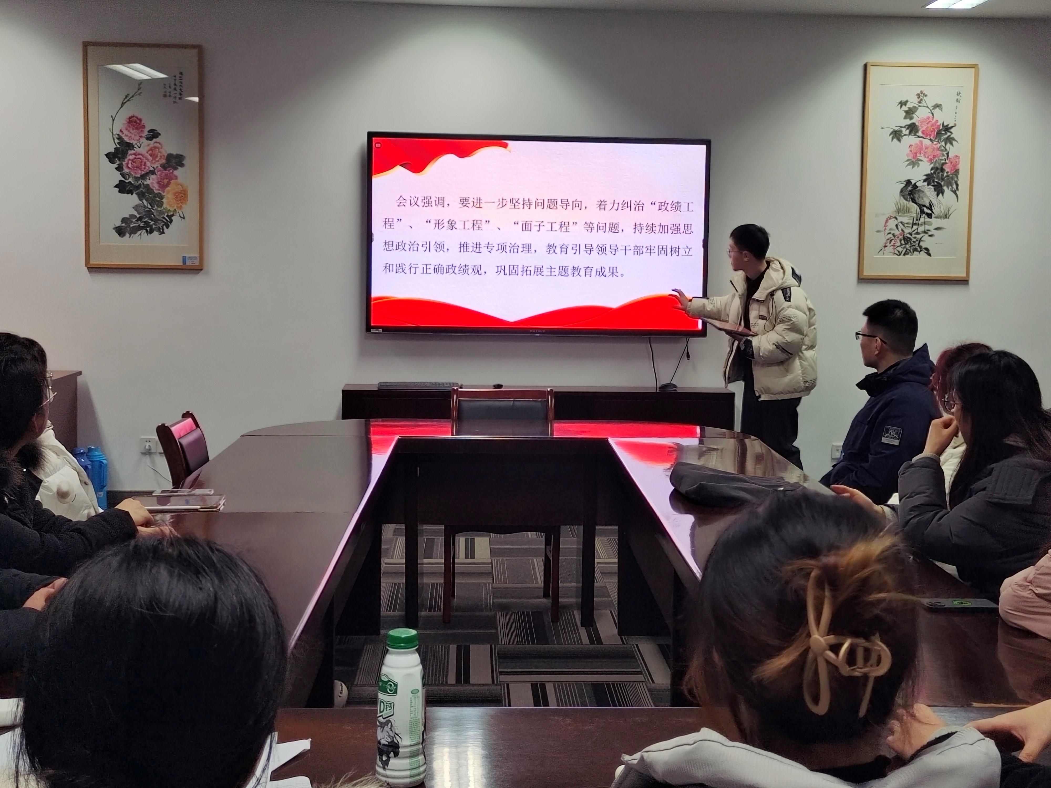 王朝辉同学主要介绍了中央层面整治形式主义为基层减负专项工作机制会议的核心内容。要求进一步坚持问题导向,着力纠治“政绩工程”、“形象工程”、“面子工程”等问题,并以此出发列举了八项解决措施,为基层减负提供借鉴,为以中国式现代化全面推进强国建设、民族复兴伟业提供坚强作风保证。