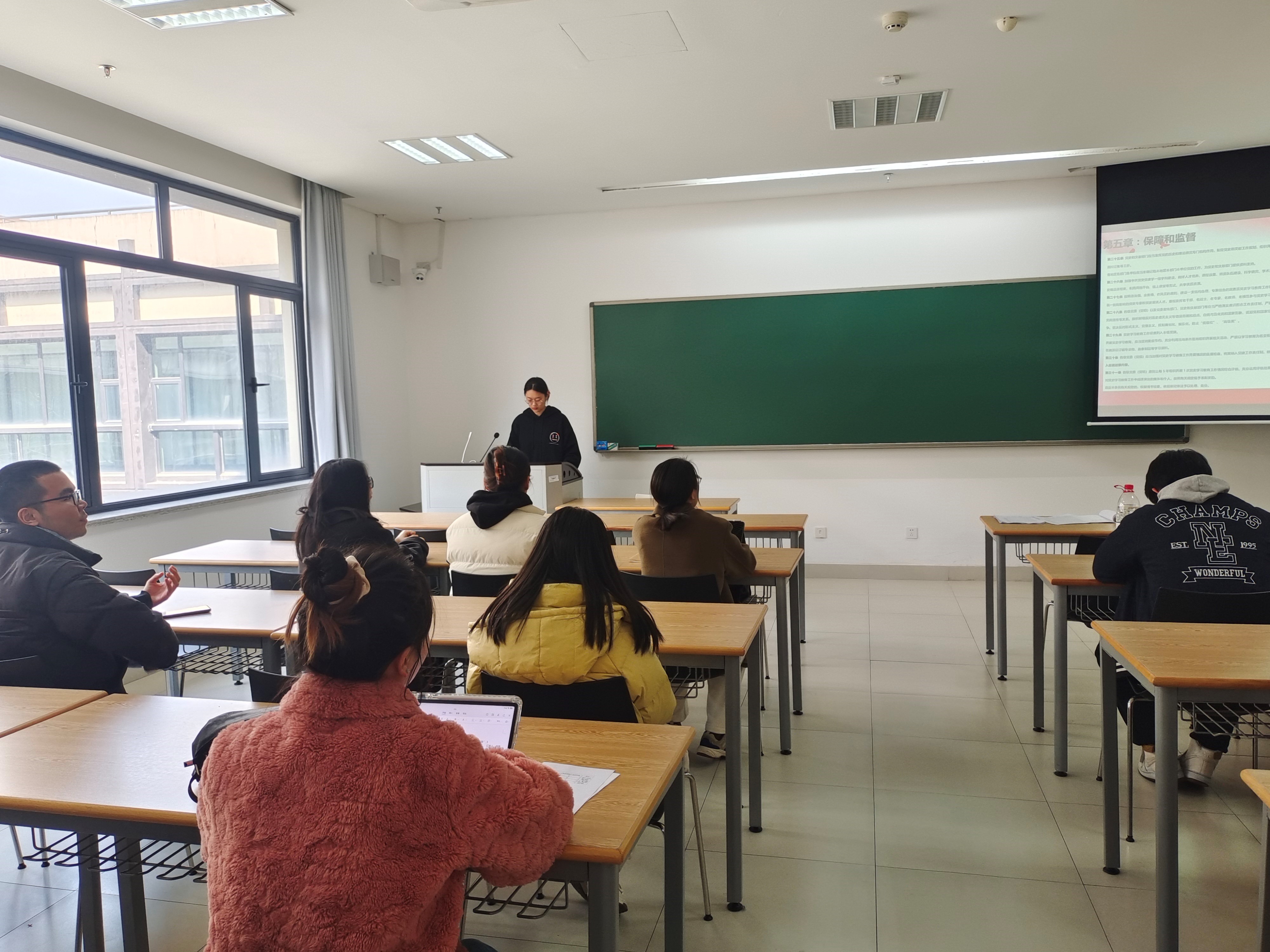 施书安同学介绍了该条例的颁布和中央重要通知,通知指出开展党史学习教育的重要性,要贯彻落实党史学习,将党史学习与中心工作结合,促进学习成果转化。同时他提出了党史学习中可能存在的问题和一些措施来贯彻落实党史学习。