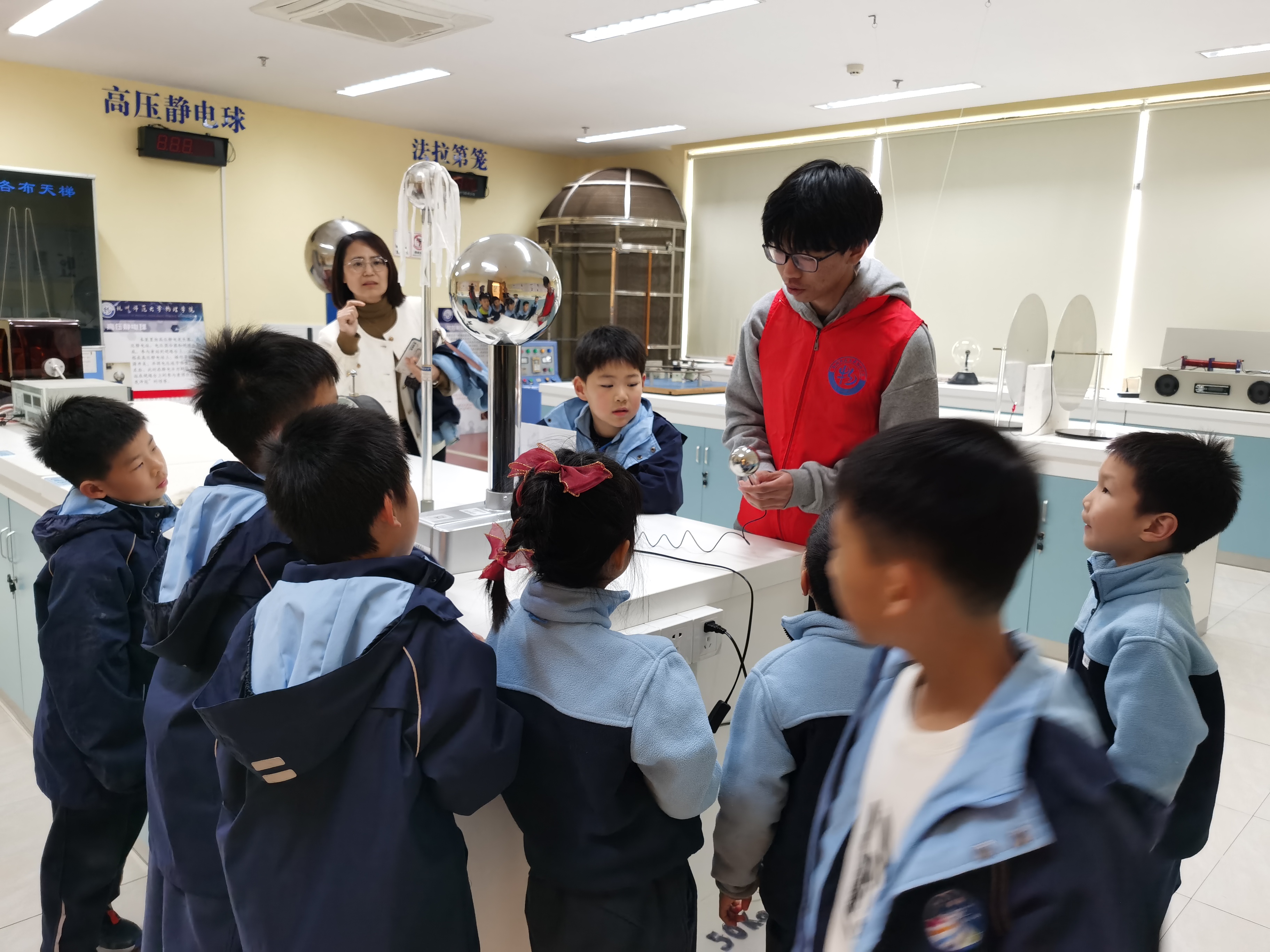 活动伊始,孩子们在包含引导与鼓励的讲解声中,纷纷睁大了好奇的双眼。“为什么珠串形成的图案会改变呢?”“她的头发发生了什么变化?”“生活里是不是有类似的现象?”“还有谁想来试一试?”……穿梭在力光磁电的奇妙现象中,孩子们就像是跳进了一本物理学书。讲解员们结合一年级学生的知识储备,将现象的成因用科学而生动的方式娓娓道来,推动孩子们在学习知识与亲手实验的过程中,沉浸式地体验科技与知识的美感。