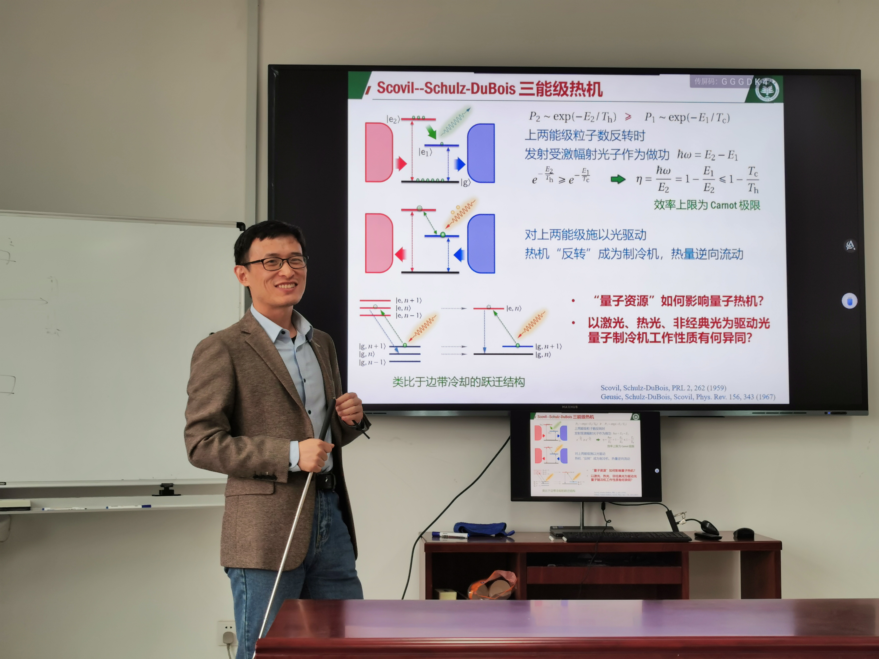4月12日下午,北京理工大学李圣文副研究员应邀来换妻 作题为“非经典光驱动的量子制冷机”的学术报告。非经典光在量子精密测量等领域有着广泛应用。报告中,李圣文研究员介绍了一个由多能级构成的量子制冷机,在驱动光作用下可驱使热量由低温热源流向高温热源。当分别以单模激光、热光、非经典反聚束光作为驱动光时,此量子制冷机产生的制冷功率在相同强度下,以激光作为驱动光时制冷功率最大。