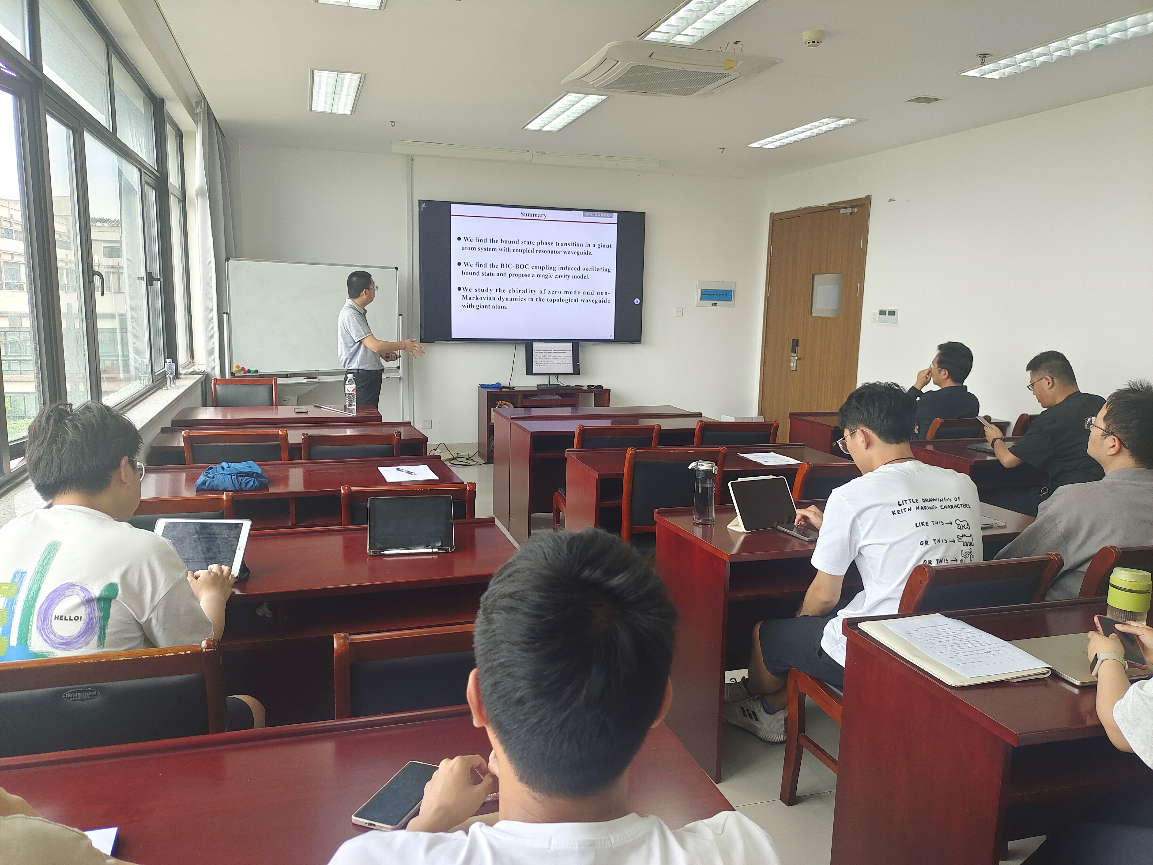 王治海教授首先为大家深入浅出地介绍了报告的背景知识。他运用生动形象的例子,解释了巨原子、magic cavity以及手性等复杂概念,使在场的师生们对这些前沿物理概念有了初步的认识和了解。紧接着,王教授详细阐述了其近期在巨原子波导电动力学系统研究中的一系列重要成果。他重点分享了具有耦合谐振腔波导的巨原子系统中束缚态相变的研究进展,以及BIC-BOC耦合诱导的振荡束缚态现象。此外,王教授还提出了一个独特的幻腔模型,引发了与会人员的浓厚兴趣和热烈讨论。在报告的后半部分,王教授进一步探讨了含巨原子拓扑波导中零模和非马尔可夫动力学的手性特性,并指出了当前研究中存在的挑战以及未来的研究方向。他的独到见解和深刻分析,为换妻 师生提供了新的研究思路和方向。