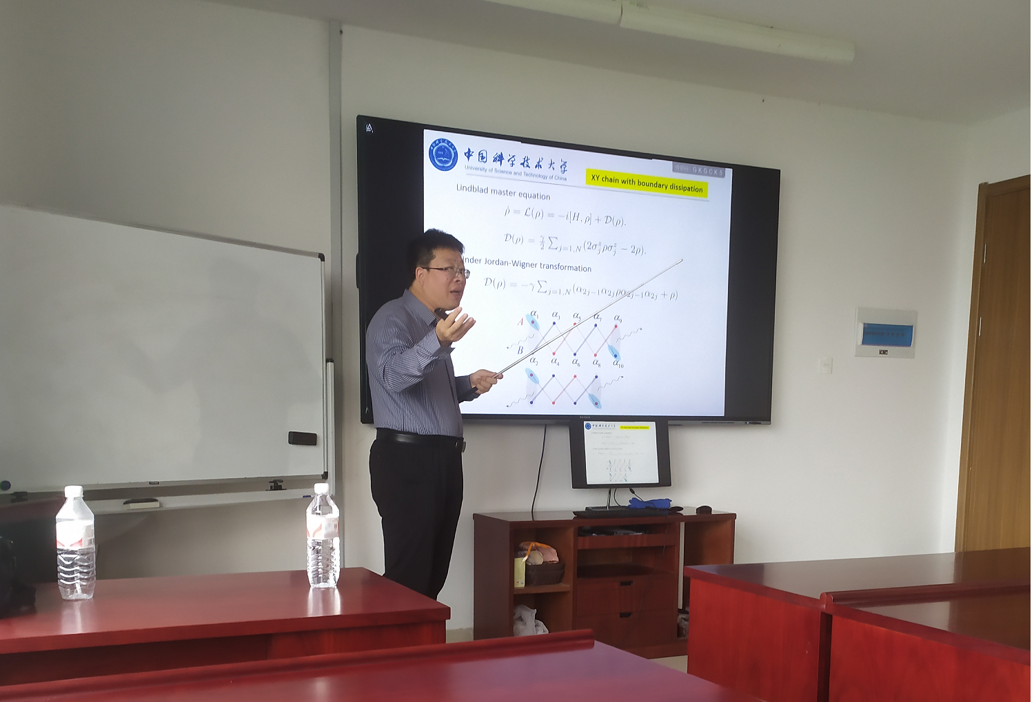 周正威教授首先为大家深入浅出地介绍了报告的背景知识。他首先解释了马约拉纳零模的概念以及量子XY链的性质等,使在场的师生们对这些前沿物理知识有了初步的认识和了解。接着,周教授介绍了耗散诱导的刘维-马约拉纳模式,并介绍了近期的一系列研究:在带有横场耗散的一维伊辛自旋链模型中,存在拓扑非厄米的刘维马约拉纳边缘模,并提出了一种检验该模式的方法;同时揭示了密度矩阵的纯度与刘维马约拉纳边缘模长程关联特性间的关系。他的独到见解和深刻分析,为换妻 师生提供了新的研究思路和方向。