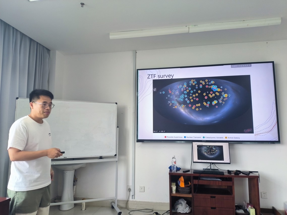 本次报告中,黄石锋博士介绍了黑洞潮汐瓦解恒星事件(TDE)的物理,并详细讲解了他们小组的一些相关天文观测最新结果,其中包括墨子巡天望远镜(WFST)运行后观测的首个TDE。同时,他们也对TDE的早期演化进行了大量多波段的观测,发现了一些新的现象,为研究这类事件的动力学过程和辐射机制提供了大量的观测依据。报告过程中,黄石锋博士与现场师生进行了热烈的讨论和交流,激发了师生们对天文学的兴趣和热情,使大家受益匪浅,也为大家后期的科学研究和科研合作打下了基础。