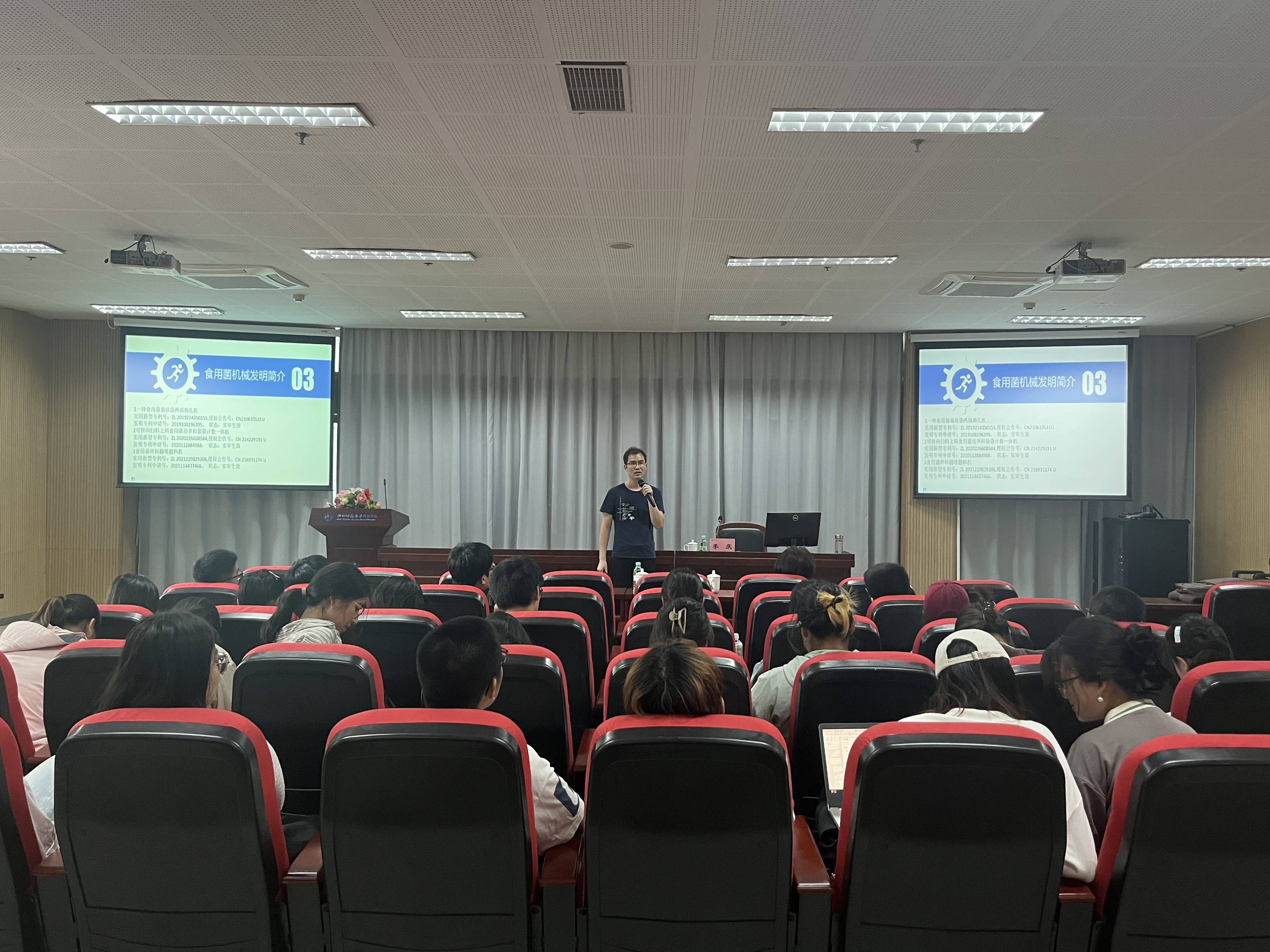 在讲座中,李老师首先介绍了目前市场上食用菌的种类、栽培方式、培育流程等,并向大家展示了他通过对生产实践的思考,自主设计并获得授权的食用菌种植相关机器发明专利。紧接着,李老师依据国家知识产权局的网站与官方文件,从专利申请系统及流程、专利申请文件及撰写、专利申请文件的主动修改与答辩、非正常专利申请与误判申诉的内容和要点四个维度与大家分享其实践经历与宝贵经验。最后,李老师勉励同学们要坚持探索,相信自己持续不断的创造力,为实现自己的思想而接续奋斗,永不言弃。