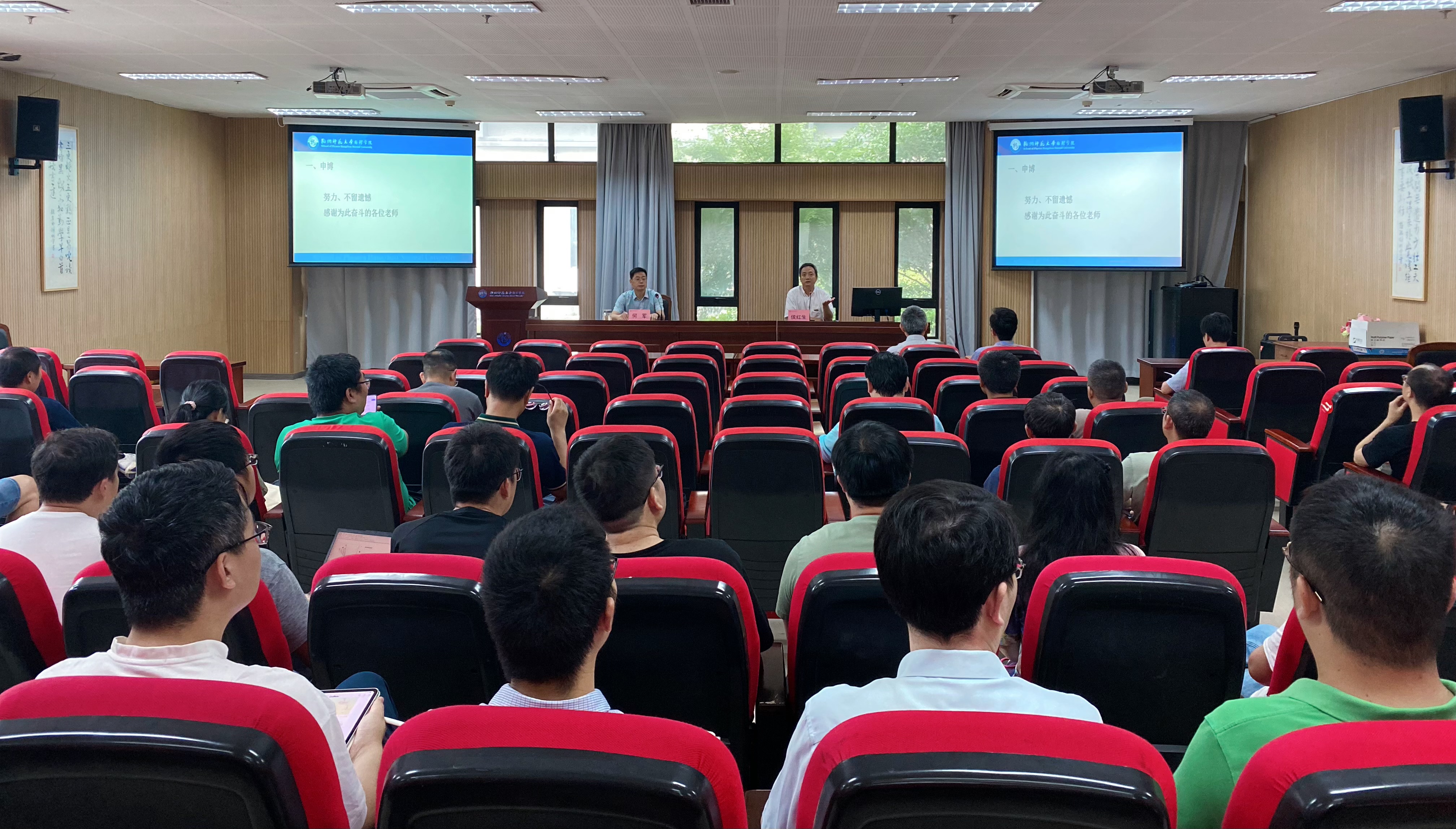 会上,院长侯红生通报了申博工作的进展情况,感谢每位为申博付出努力的老师。结合绩效考评、绩效分配改革和岗位聘任工作,他强调教师应进一步加强科研团队的合作与交流,共同推动科研水平的提升。最后,他对暑期科研、学科竞赛等进行了布置。
