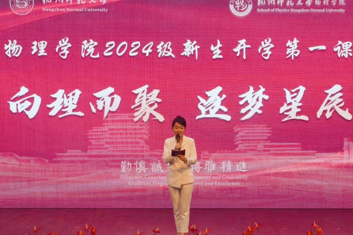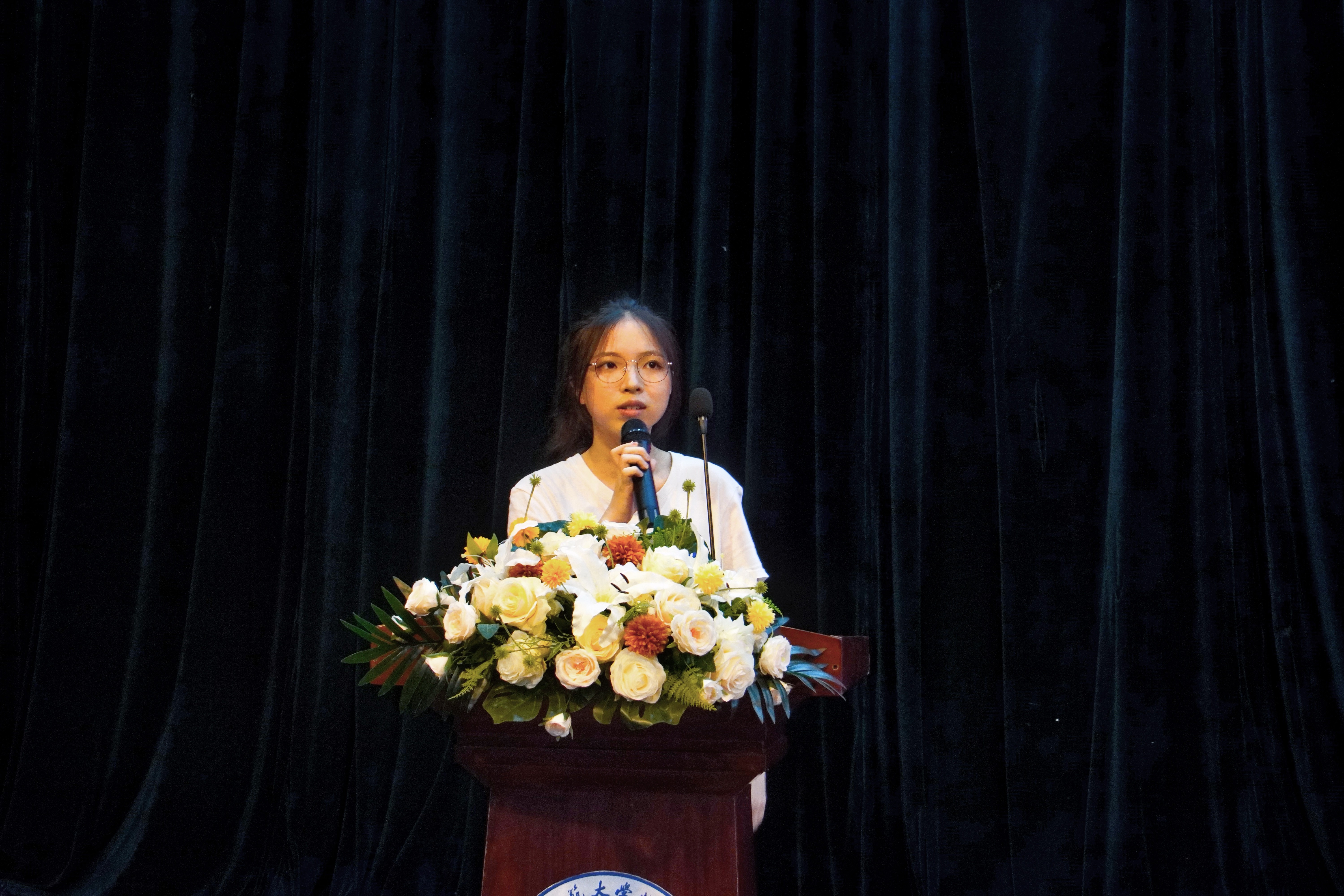 物理本硕241班陈冉同学作为新生代表,针对新生们面临的挑战和责任提出了应对之道,即信念、担当和奋斗。她呼吁新生们要团结互助,为学院和学校的发展贡献力量。
