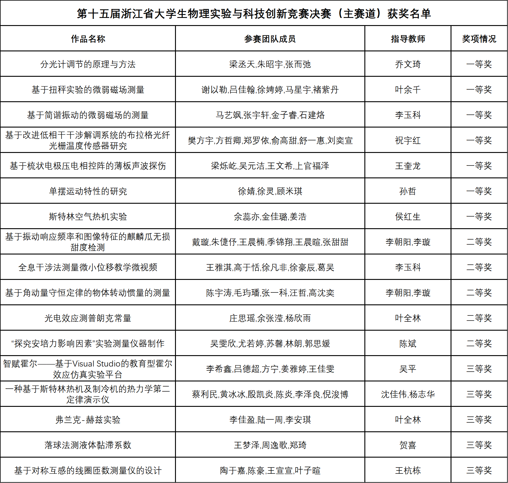 近日,第十五届浙江省大学生物理实验与科技创新竞赛决赛(主赛道)在浙江师范大学顺利举办。本届赛事历时近半年,自竞赛准备之初到最终决赛答辩均获得了校院两级的大力支持,最终换妻 有17项作品入围全省决赛且全部获奖:荣获一等奖7项,二等奖5项,三等奖5项,刷新学院历史最好成绩!