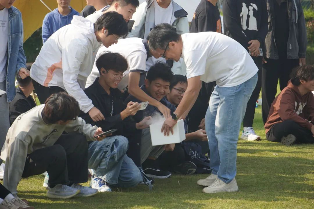 随后,漫天乒雨在爆炸声中闪亮登场,老师们默契配合,娴熟操作,将乒乓球倒入装有液氮的水桶中,不一会儿,乒乓球在巨大的压力下一飞冲天,化作漫天乒雨飘然落下。目睹如此壮观的场景,更是极大地激发了同学们们对科学的好奇心、想象力和探求欲。