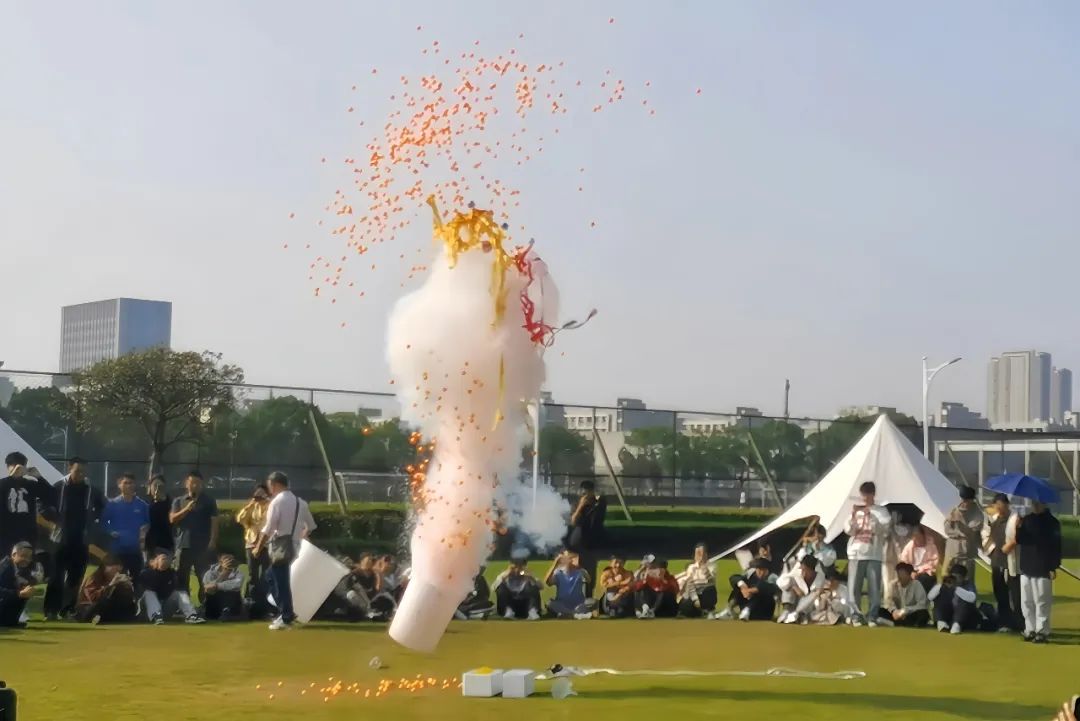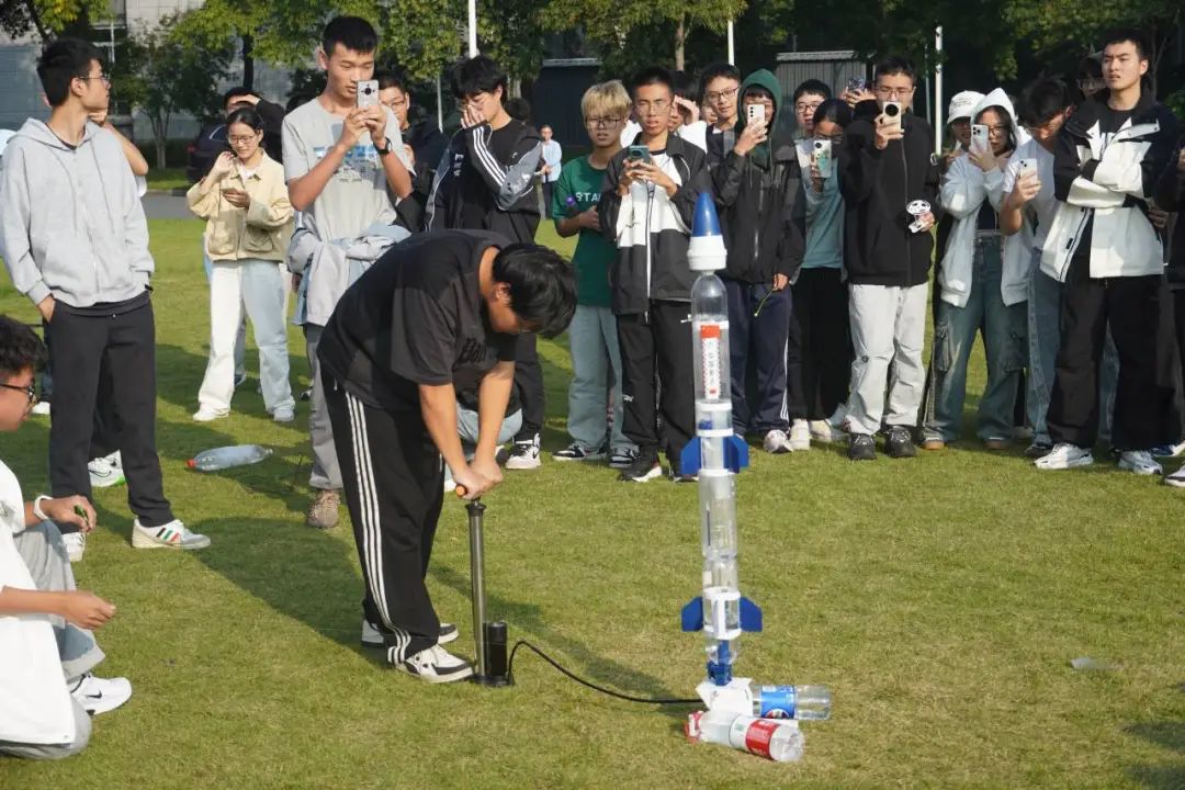 最后,杨旭昕老师组织同学们进行水火箭实验,同学们积极地展示了自己前期创作的水火箭作品,当水火箭划破长空,成功升空的那一刻,同学们的努力与汗水都化为了无尽的喜悦与自豪。水火箭实验不仅让我们见证了科学的魅力,更深刻地理解了团队合作、坚韧不拔与勇于探索的价值。