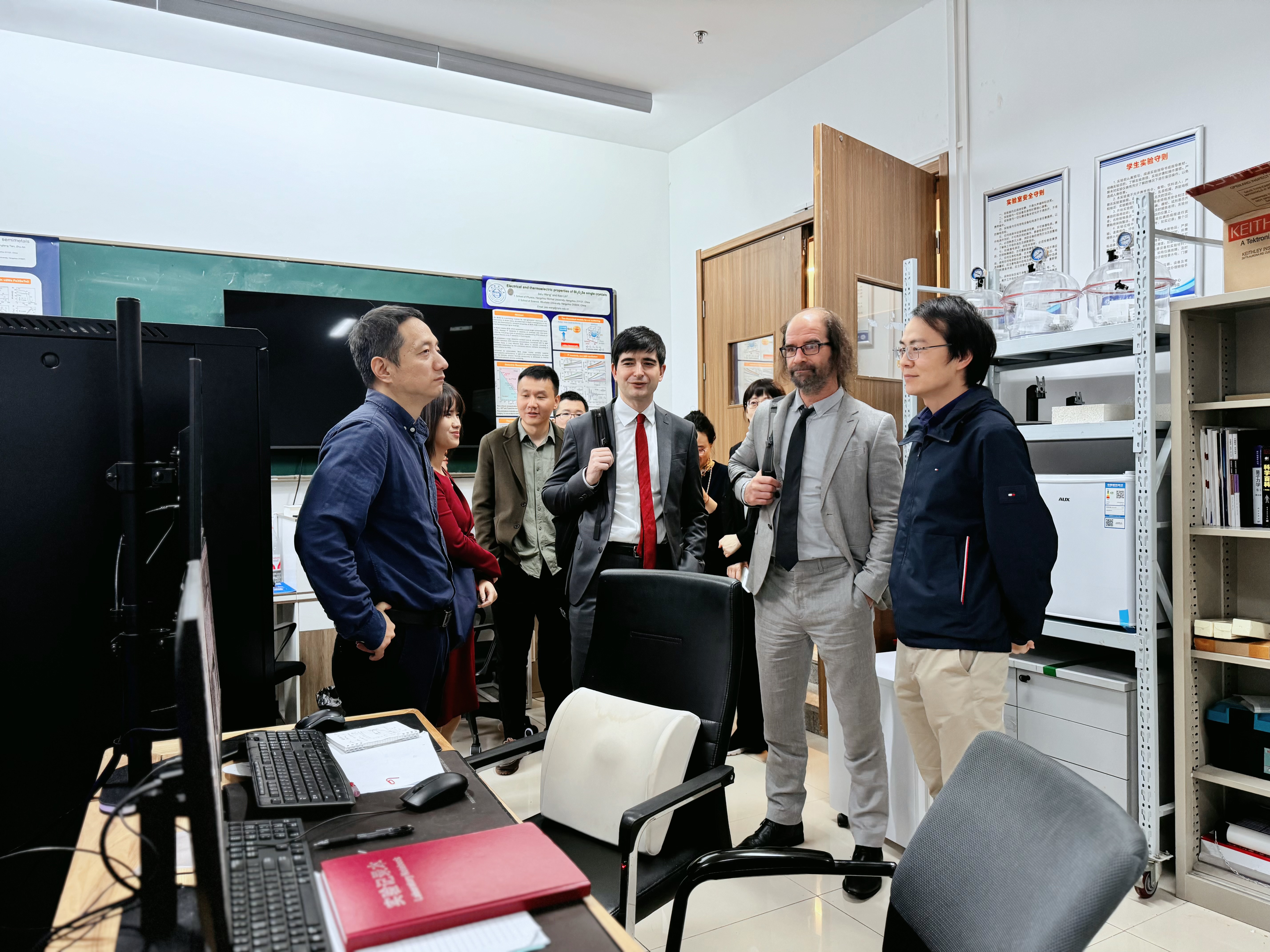 钟建强教授和鲍金科副教授分别向代表团详细介绍了学院的科研设备和正在开展的研究工作,重点介绍了学院的综合物性表征系统、超高真空红外光谱系统以及隧道扫描显微镜系统。这些先进的科研设备为学院的科研工作提供了强大的技术支持。特别是钟教授课题组搭建的超高真空红外反射吸收光谱系统,引起了代表团成员们的极大兴趣,详细询问了相关的研究情况。鲍金科介绍了他科研中经常使用的低温输运测量装置,对于揭示材料的奇异量子物性非常关键。近期发表在Nature上关于笼目超导体的研究就用到了类似的输运测量装置。这一研究成果不仅展示了鲍金科团队的科研实力,也为双方在未来的科研合作提供了更多的可能性。