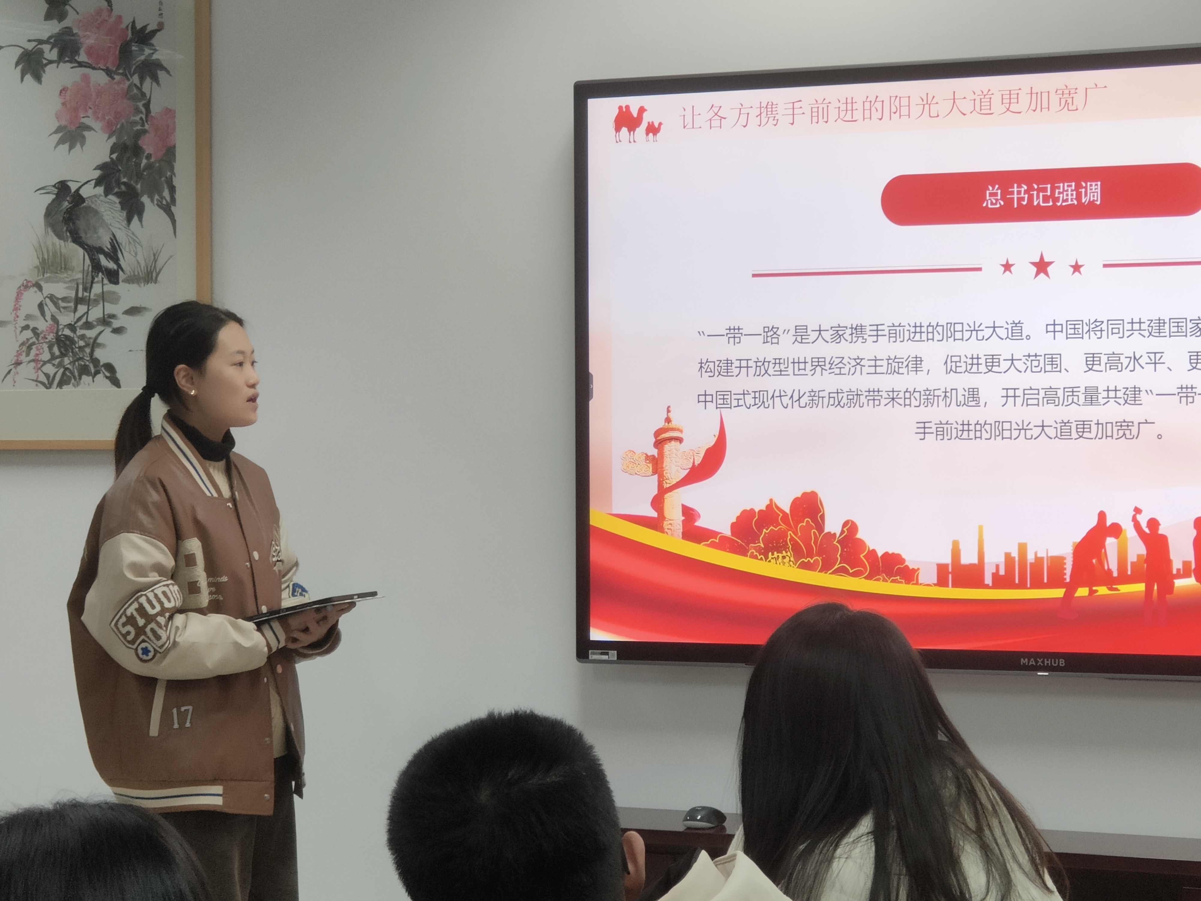 2024年12月18日,换妻 学生第一党支部于勤19-226党员之家开展了十二月主题党日活动,由徐若言、郑罗依两位党员分享他们关于全面推动共建“一带一路”高质量发展以及必须坚持守正创新的心得体悟。