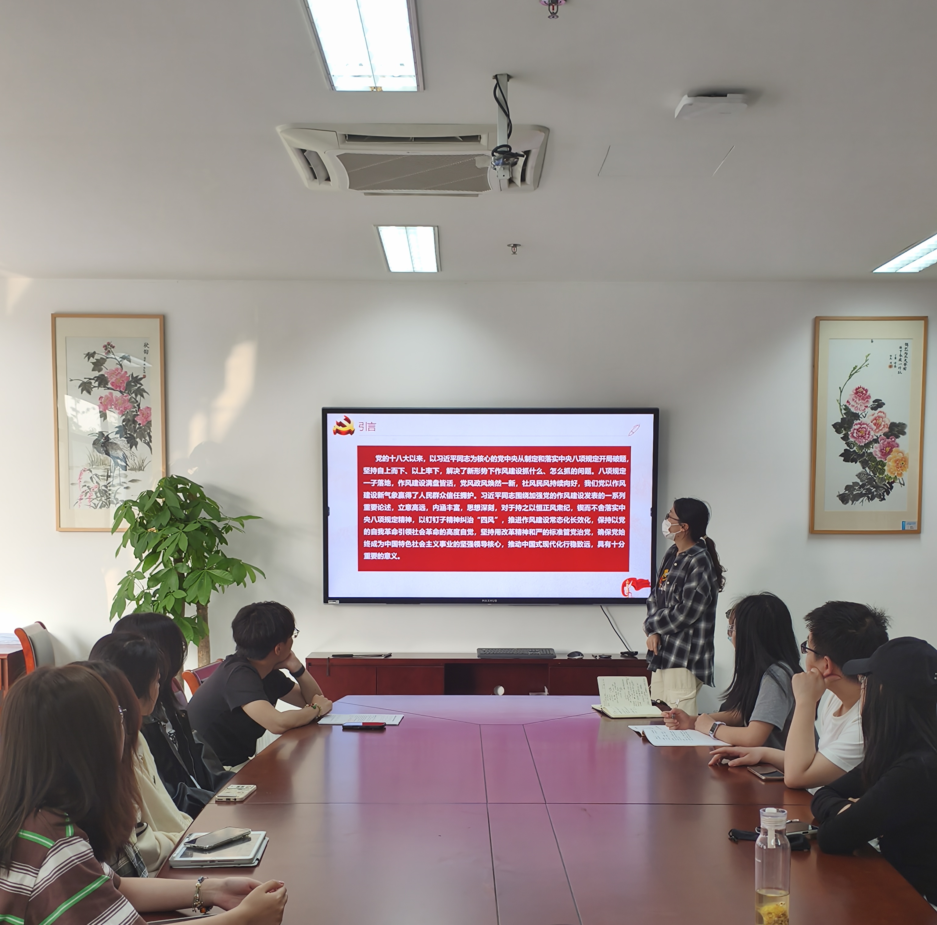 周彦希同学就“中央八项规定精神”的出台背景、基本内容、落实情况进行了学习分享,并结合生动的视频,带领党员们回顾了中央八项规定从颁布到落实多年发生的重大转变。党员们通过视频了解了规定颁布前的诸多乱象,由此感受到中国共产党刀刃向内、主动强化监督执纪的重大决心和恒心,也切实体会到这一规定落实后的重大成果和深远意义。