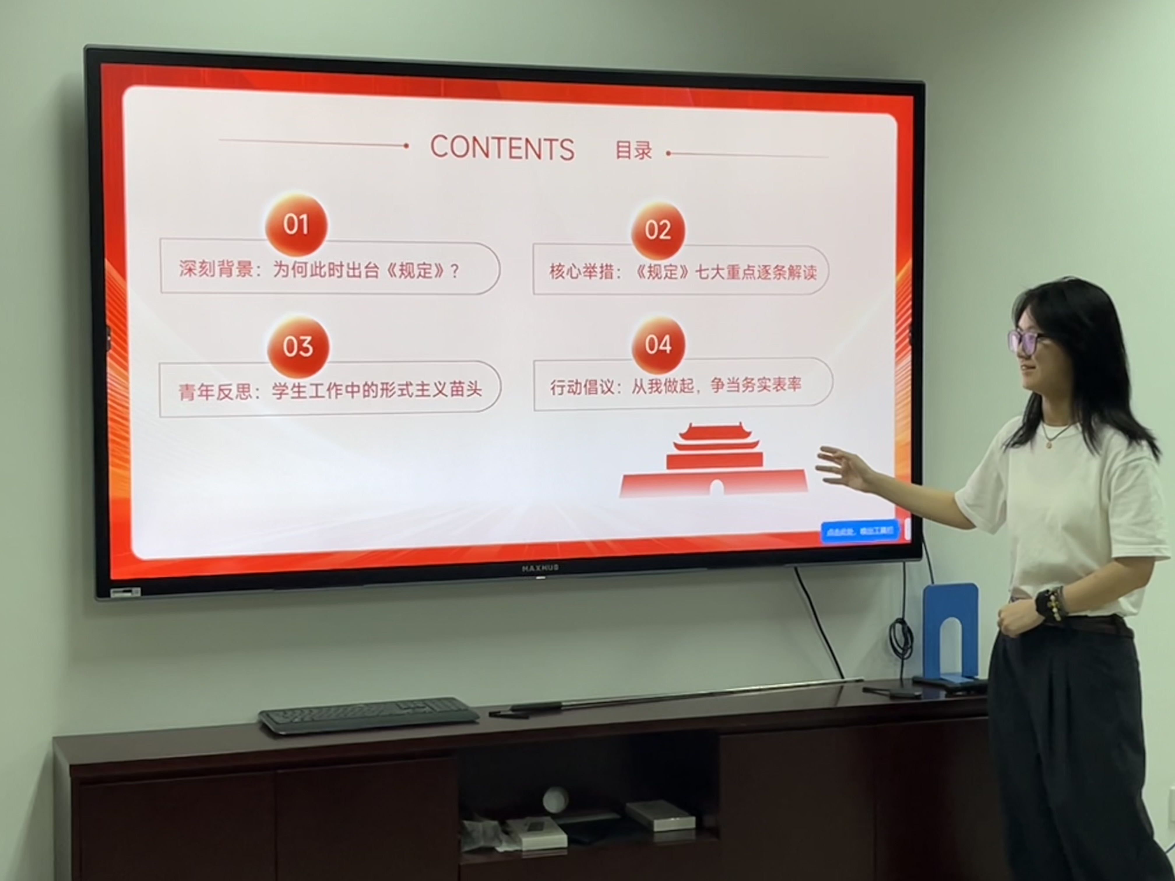 周逸歌聚焦《整治形式主义—为基层减负的通知》开展分享,号召大家争当务实表率:强化思想认识,树立“重实干、重实绩”观念;勇于批评监督,对形式主义苗头说“不”;坚持实事求是,不搞花架子与表面文章;聚焦主责主业,投入到专业学习与为民服务中去,发挥党员先锋模范作用。