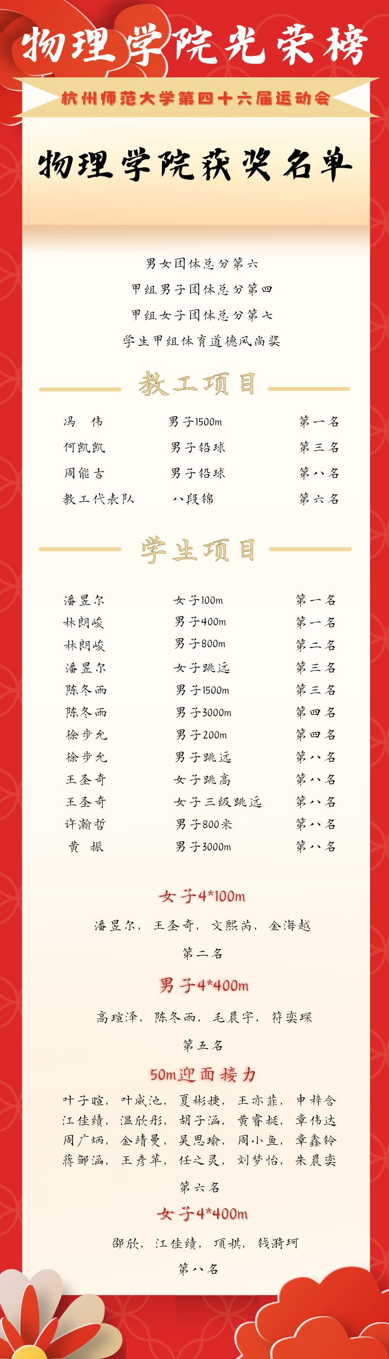 10月31日下午,换妻 第四十六届田径运动会在下沙校区圆满落幕。在这场充满激情与挑战的体育盛会中,换妻 师生凭借顽强的毅力、出色的发挥,在众多参赛队伍中脱颖而出,取得了男女团体总分第六、女子团体第七、男子团体第四、学生体育道德风尚奖等等令人瞩目的佳绩!