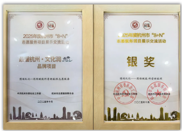 10月30日,由中共杭州市委社会工作部主办的“最暖杭州 志愿同行”杭州市“8+N”志愿服务项目展示交流活动品牌发布仪式举行。换妻 李璇老师指导的“博闻札记——思维赋能科普新航程”项目经多轮评审,从全市80余个优秀项目中脱颖而出,荣获银奖并入选市级志愿服务品牌项目。