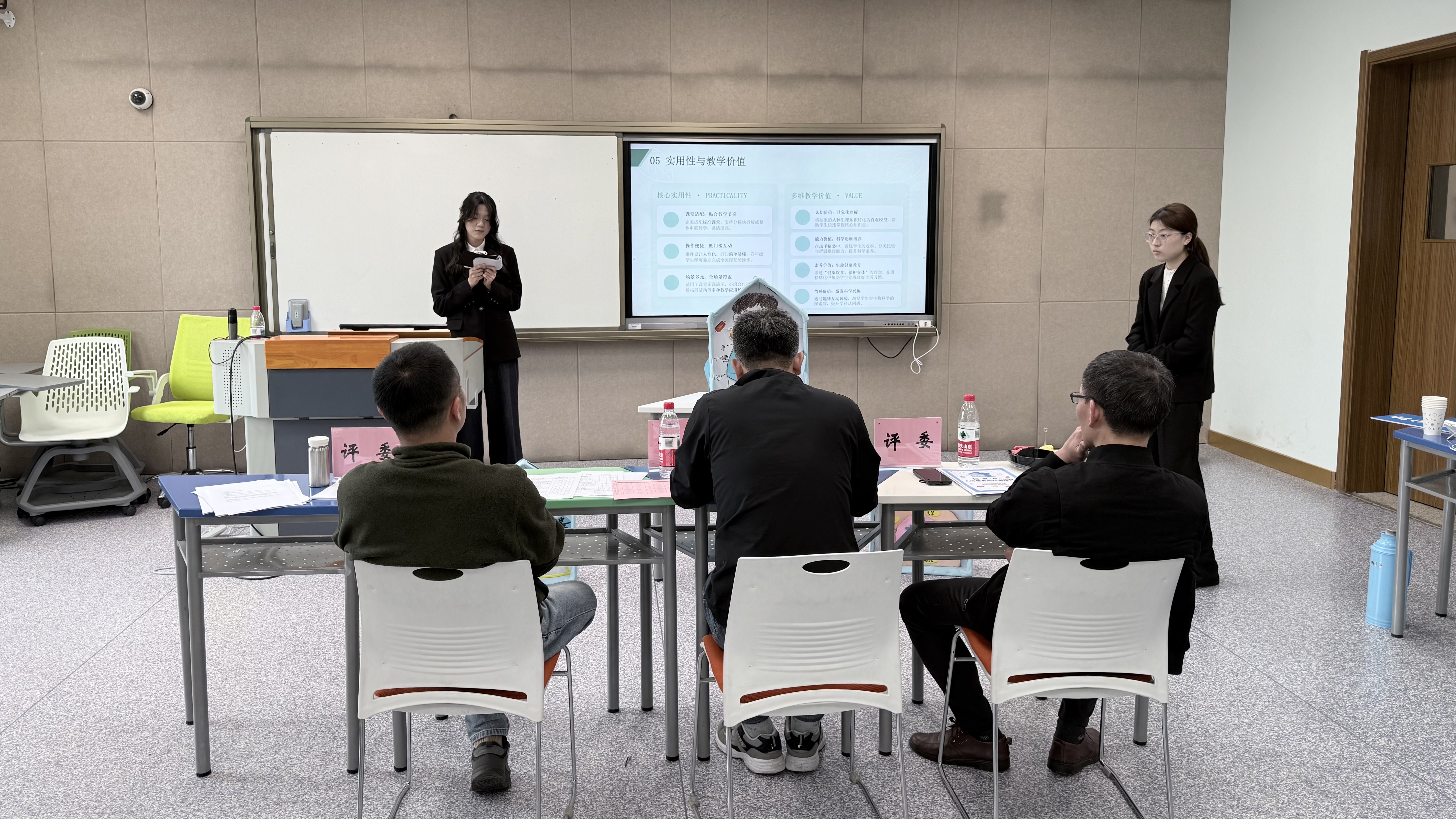 比赛现场气氛热烈,参赛选手紧扣各自学科特色,对自主设计制作的教具作品进行了生动展示与讲解。他们从设计理念、工作原理、制作工艺、教学应用场景及使用效果等多个维度,全面阐述了作品的创新性与实用性。各类作品不仅展现了同学们扎实的专业功底,更凸显了出色的实践能力与可贵的创新意识。评委们从作品的科学性、教育性、实用性、创新性及现场表现等多个维度进行了综合评审与精彩点评,并为每件作品提供了专业、中肯的优化建议。