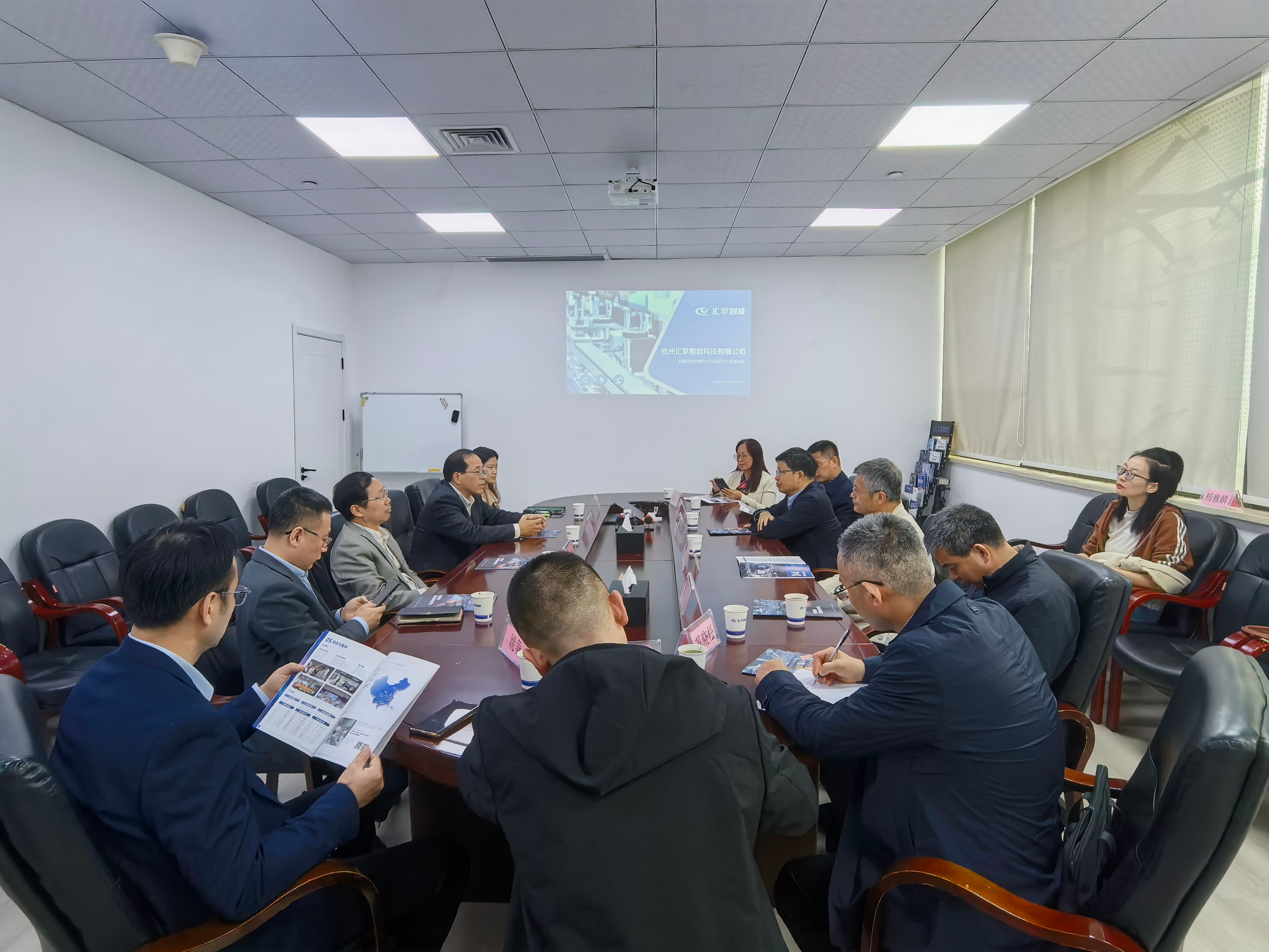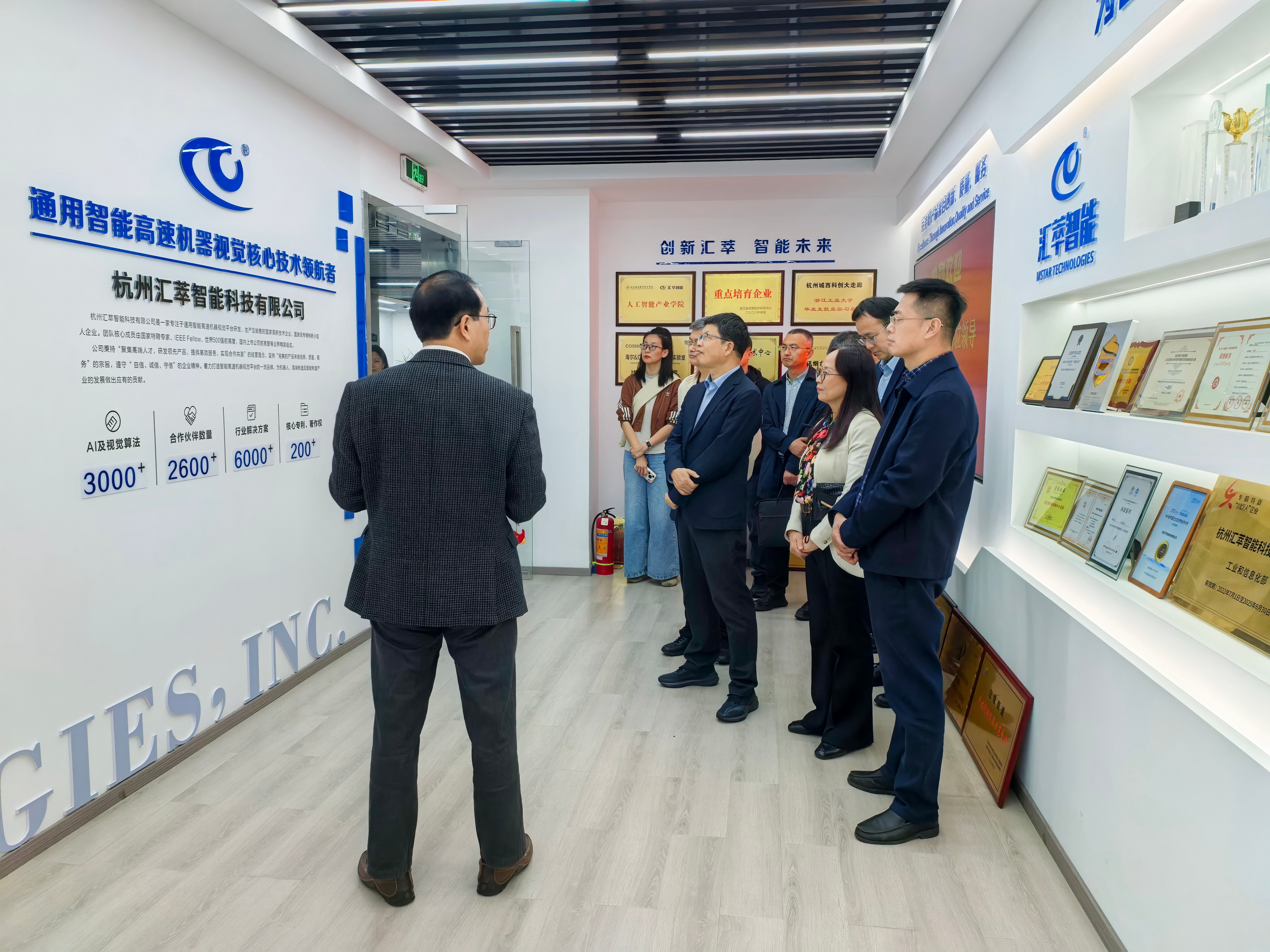 在国家级专精特新重点“小巨人”企业——杭州汇萃智能科技有限公司,公司董事长兼总经理周才健陪同参观企业科创成果展厅,重点介绍机器视觉、智能制造领域的核心技术及产业化布局。座谈会上,双方围绕产学研协同创新、人才联合培养、毕业生实习就业拓展等内容深入交流,达成多项合作共识。