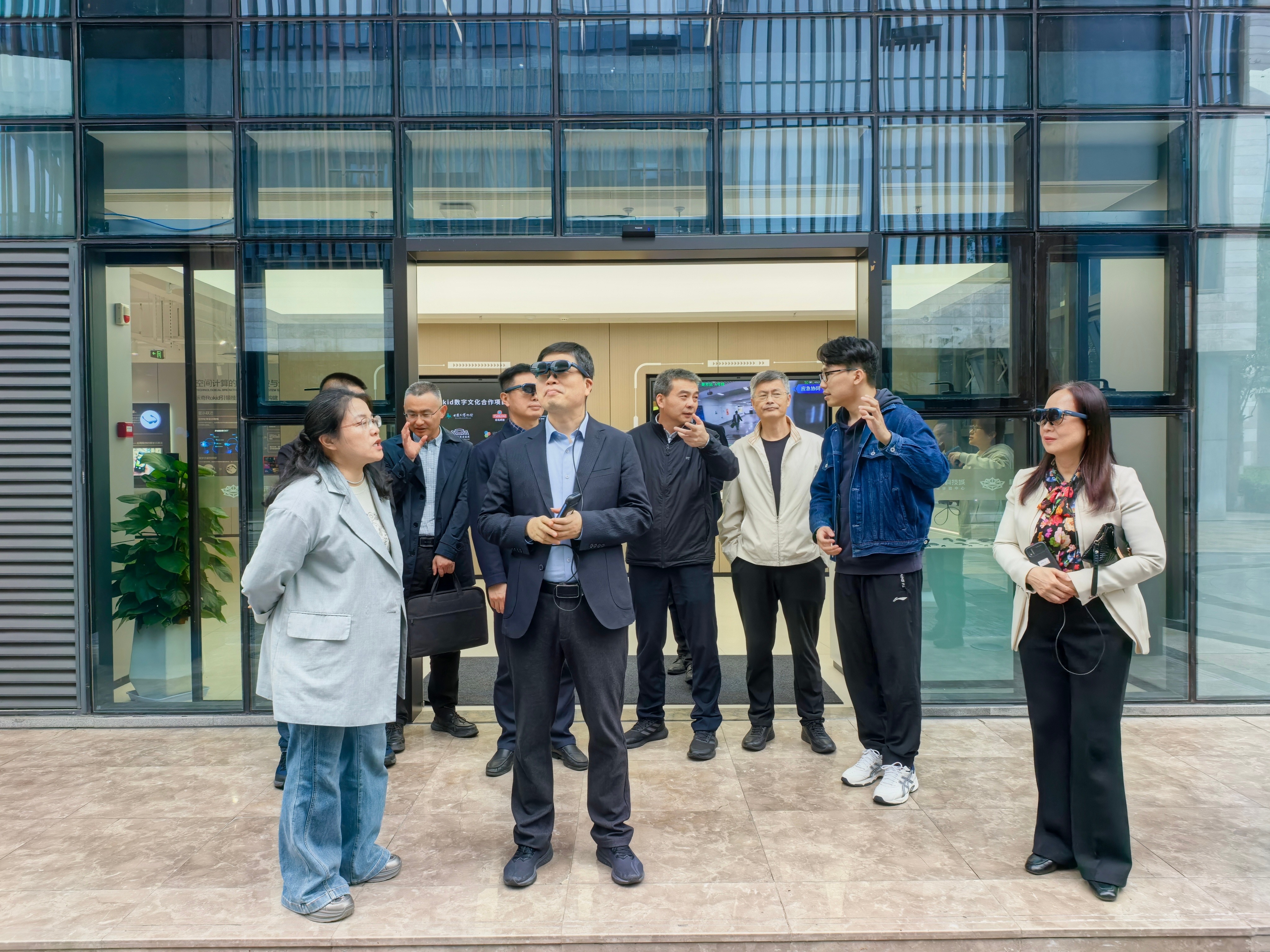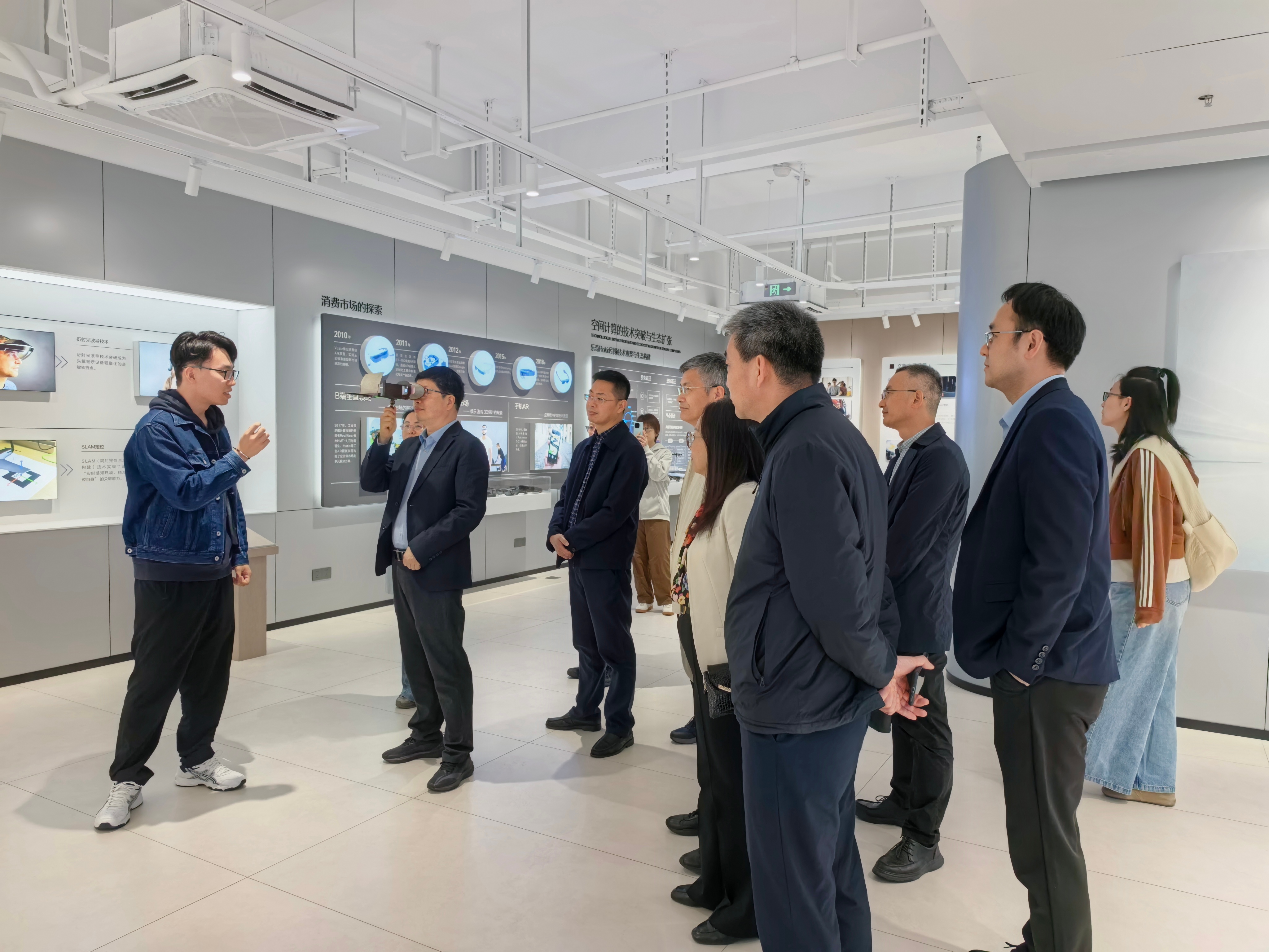 大家首先走进灵境“未来·视界”空间计算中心,深入了解空间计算技术在数字经济、智慧产业等领域的前沿应用,并沉浸式体验AI眼镜等创新产品,直观感受人工智能交互技术的最新进展,为优化人才培养方案提供实践依据。